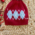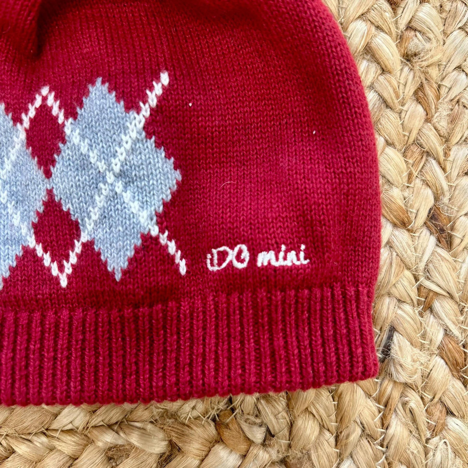 Morbido cappellino in maglia bordeaux con motivo a rombi azzurri e maxi pompon grigio. Caldo e confortevole, è perfetto per le giornate fredde e per completare con stile gli outfit invernali o natalizi del tuo bimbo.
