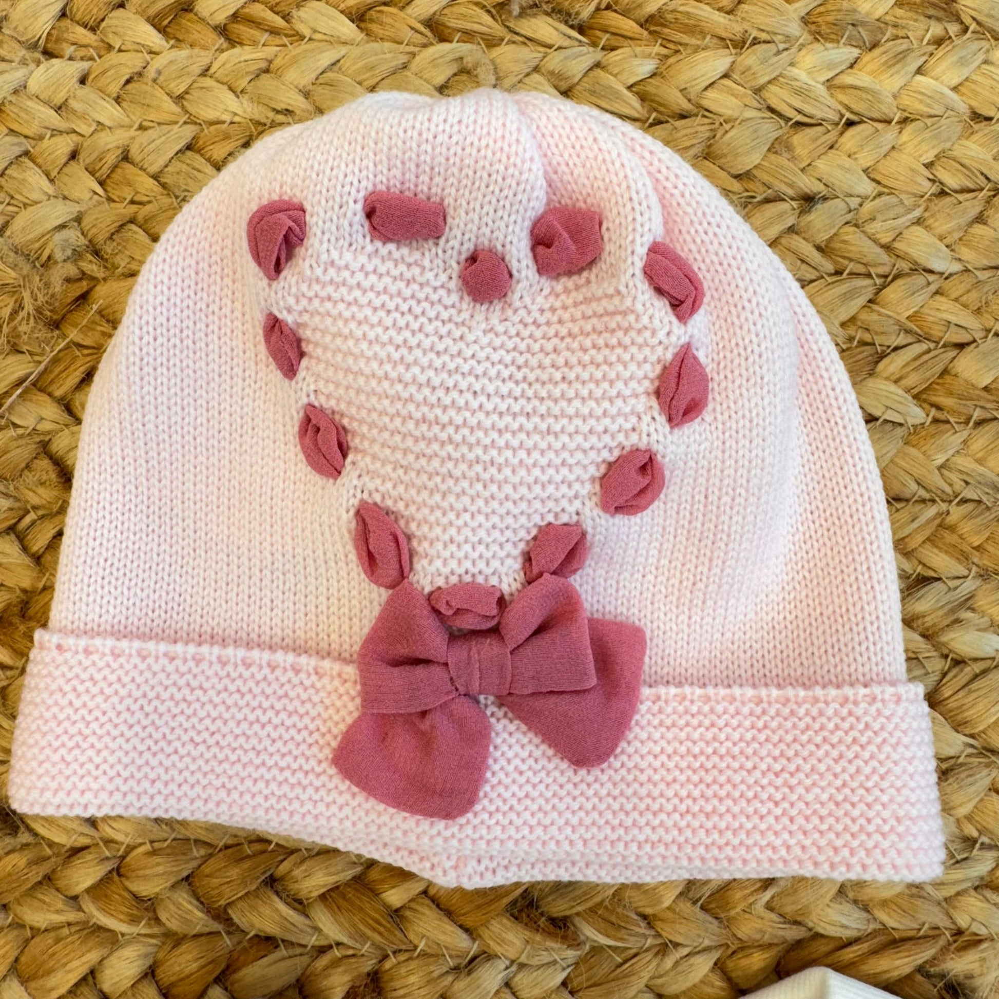 Cappellino e scarpette neonata in pura lana con fiocchi rosa