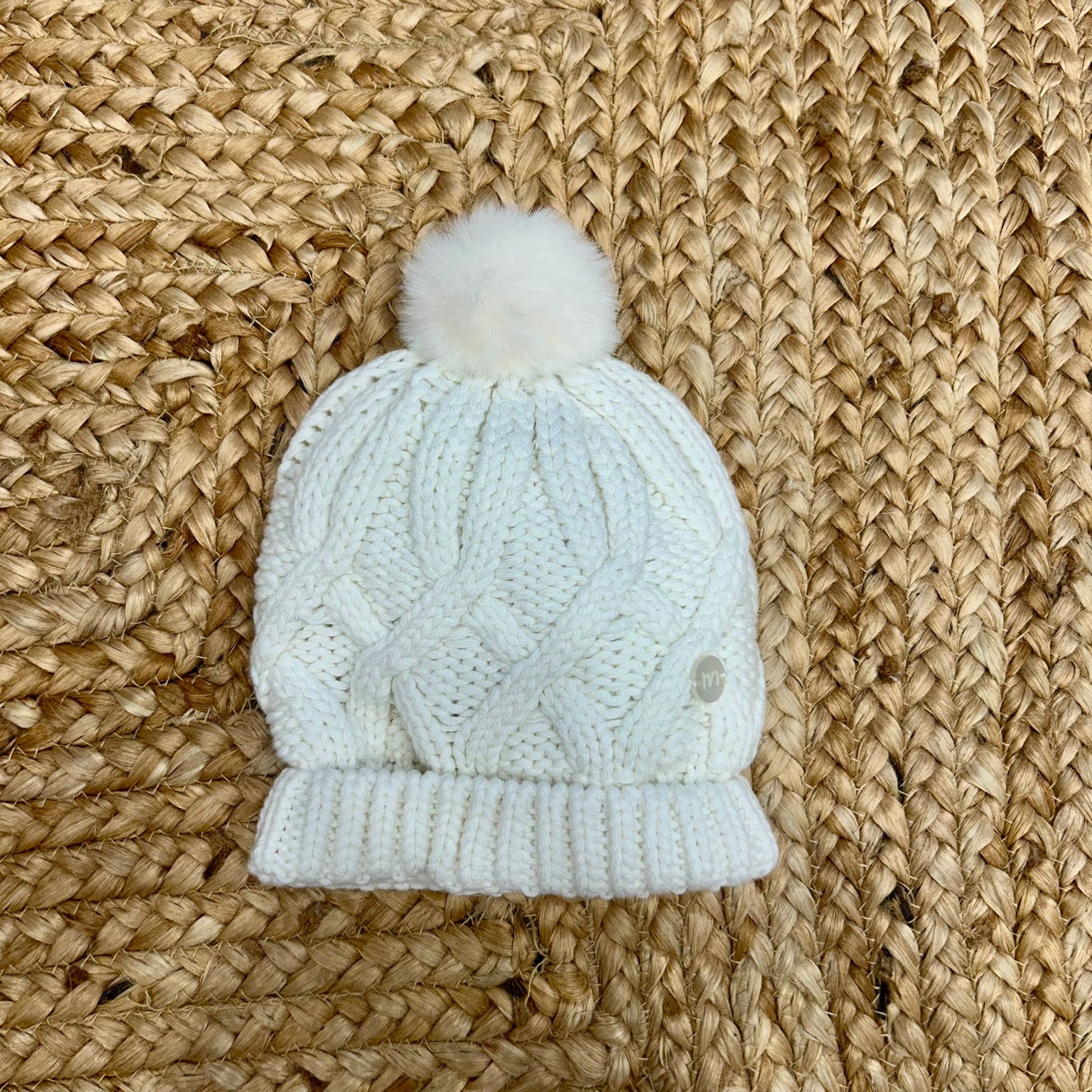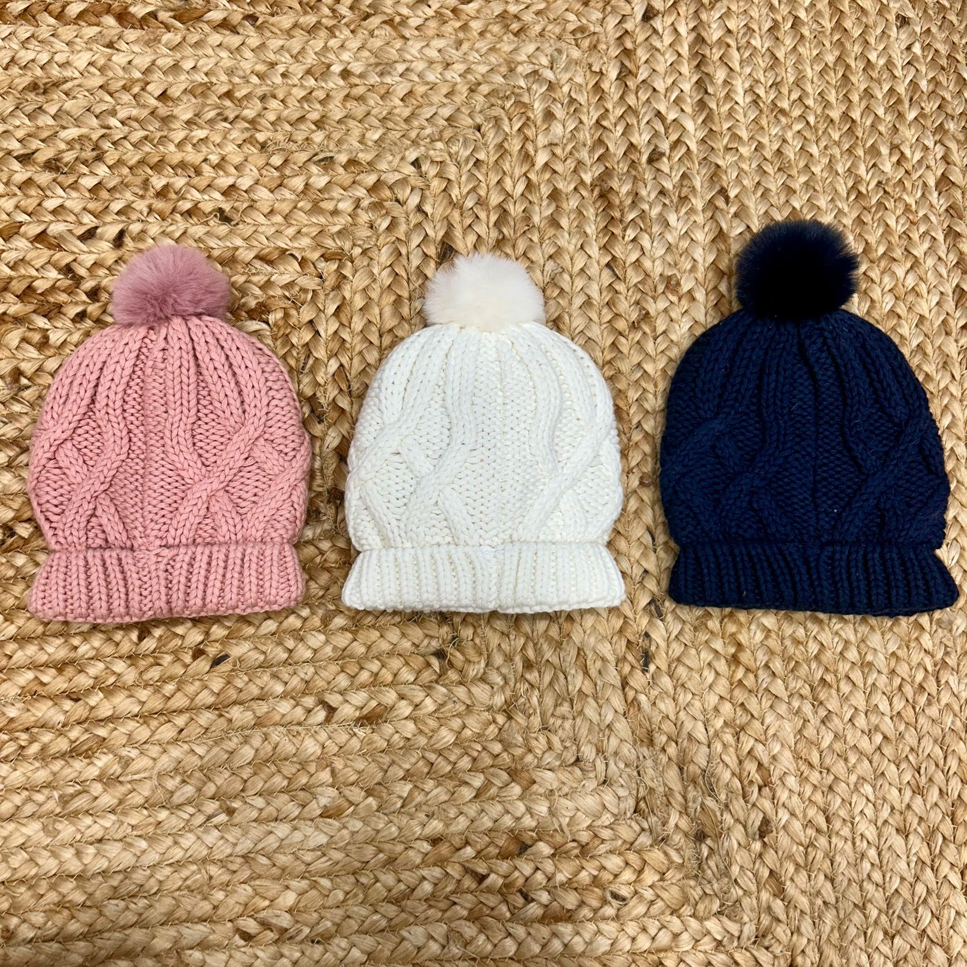 Cappellino invernale per bambina lavorato a maglia intrecciata, disponibile nei colori rosa, panna e blu navy. Morbido, caldo e confortevole, con soffice pompon e risvolto, è l’accessorio ideale per completare ogni outfit invernale o come idea regalo dolce e versatile.
