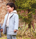 Cappotto elegante per bambino in tessuto grigio chiaro, con chiusura a bottoni e pratica zip interna. Dotato di cappuccio imbottito staccabile color panna, unisce stile classico e funzionalità moderna. Perfetto per occasioni speciali e per proteggere dal freddo con eleganza.