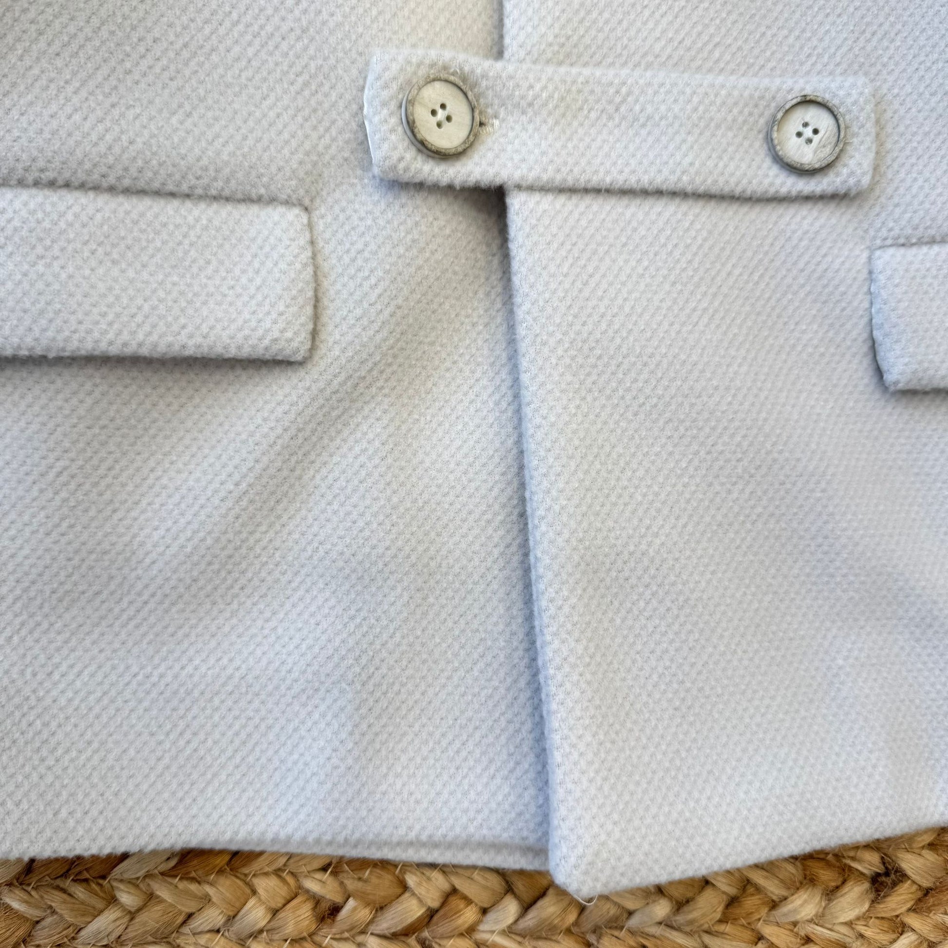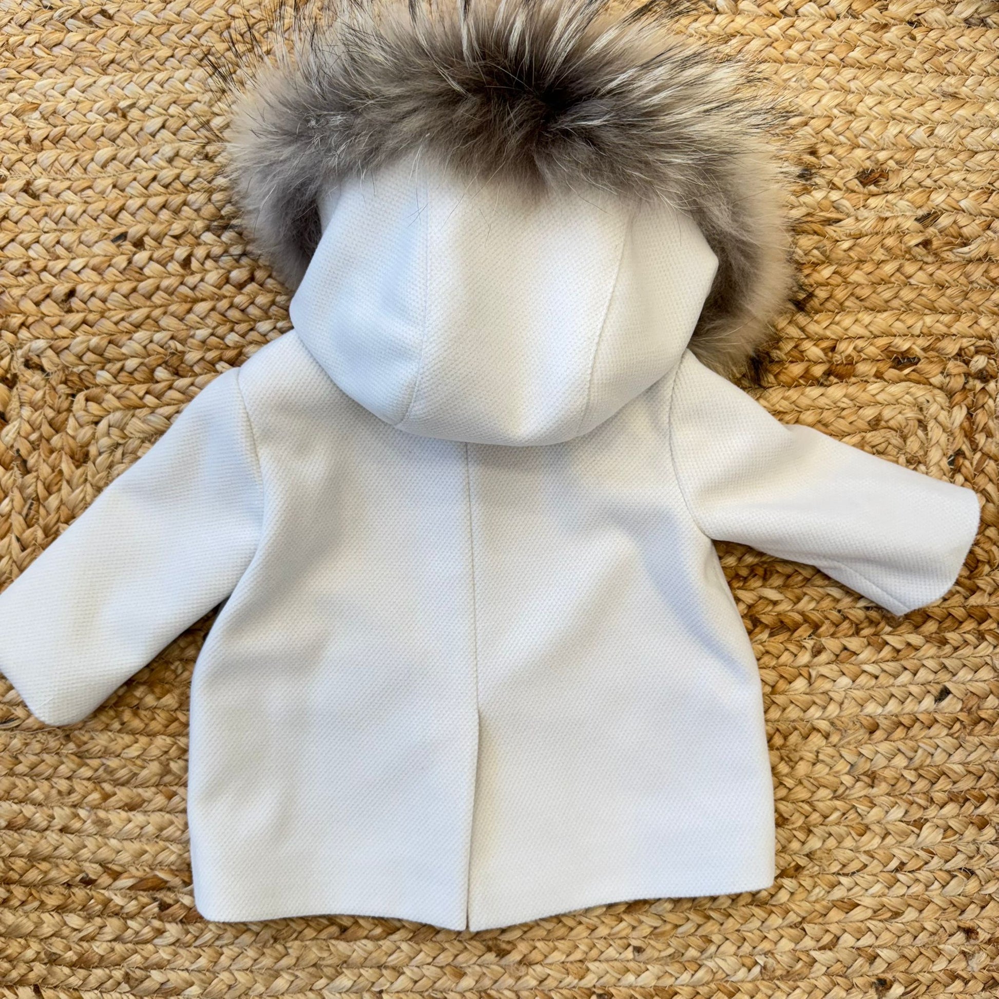 Elegante cappottino bimbo in tessuto beige con doppia abbottonatura e cappuccio bordato in morbida pelliccia effetto volpe. Un capo raffinato e caldo, ideale per cerimonie, battesimi o occasioni speciali. Le tasche frontali e la fodera interna assicurano comfort e protezione durante le giornate più fredde.