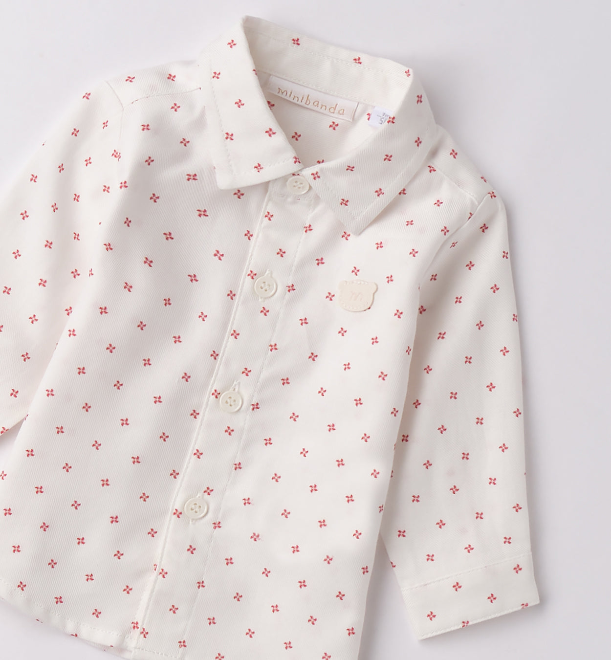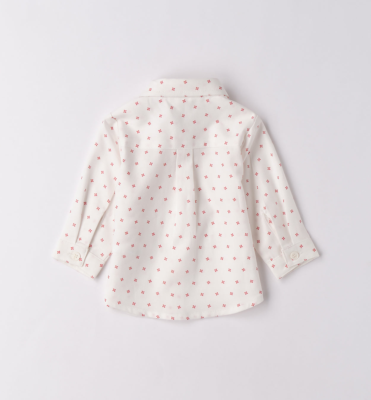 Cardigan natalizio per bimbo in maglia rossa con lavorazione a rombi e camicia bianca con micro stampa rossa. Morbido e raffinato, è perfetto per le feste, il pranzo di Natale o le foto in famiglia. Un look elegante e tradizionale per piccoli gentleman delle feste.