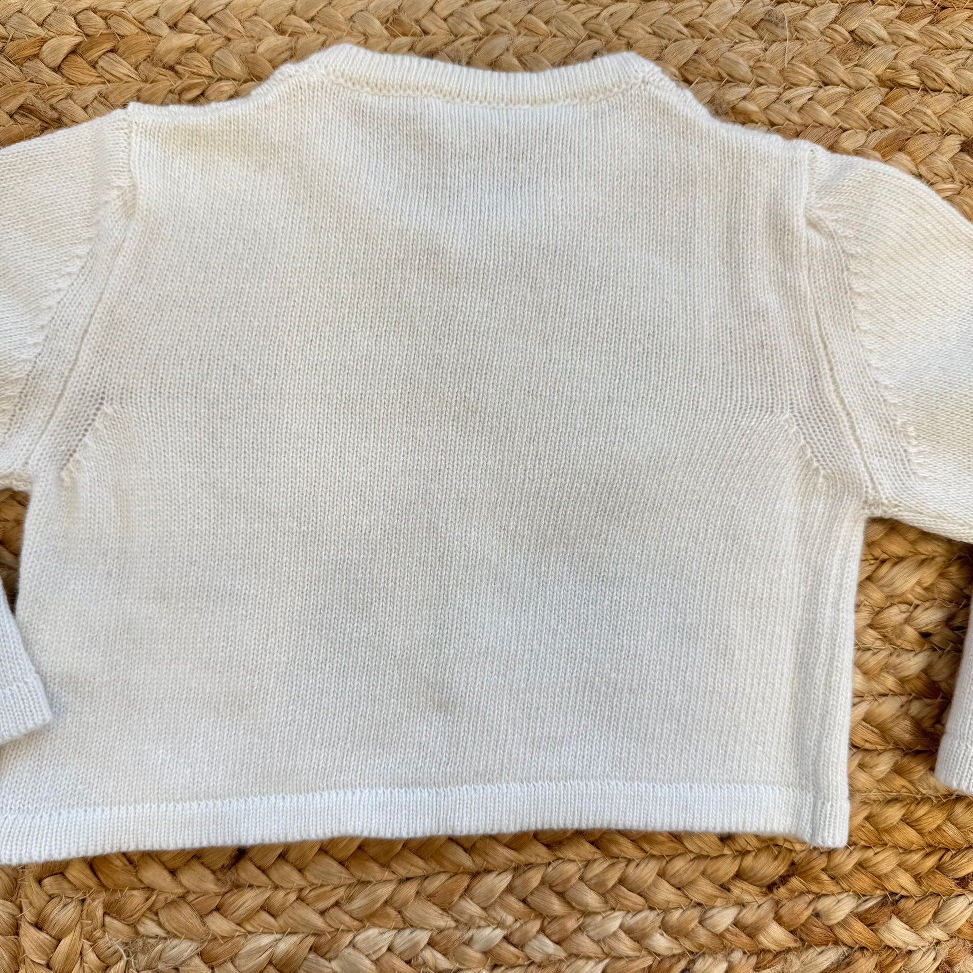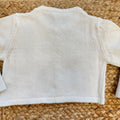 Delicato cardigan panna per neonato, lavorato a maglia fine con trecce sottili e bottoni madreperla. Morbido e confortevole, è ideale per completare look da cerimonia o battesimo con un tocco raffinato. Un capo intramontabile che unisce eleganza e praticità, perfetto per le prime occasioni speciali.(40% lana, 30% viscosa, 20% poliammidica, 10% cashmere)