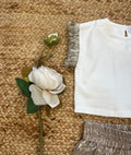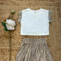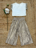Top bianco con maniche arricchite da frange lurex oro e pantaloni culotte plissé in tessuto laminato dorato. Un completo chic e scintillante, per bambine che brillano con stile.