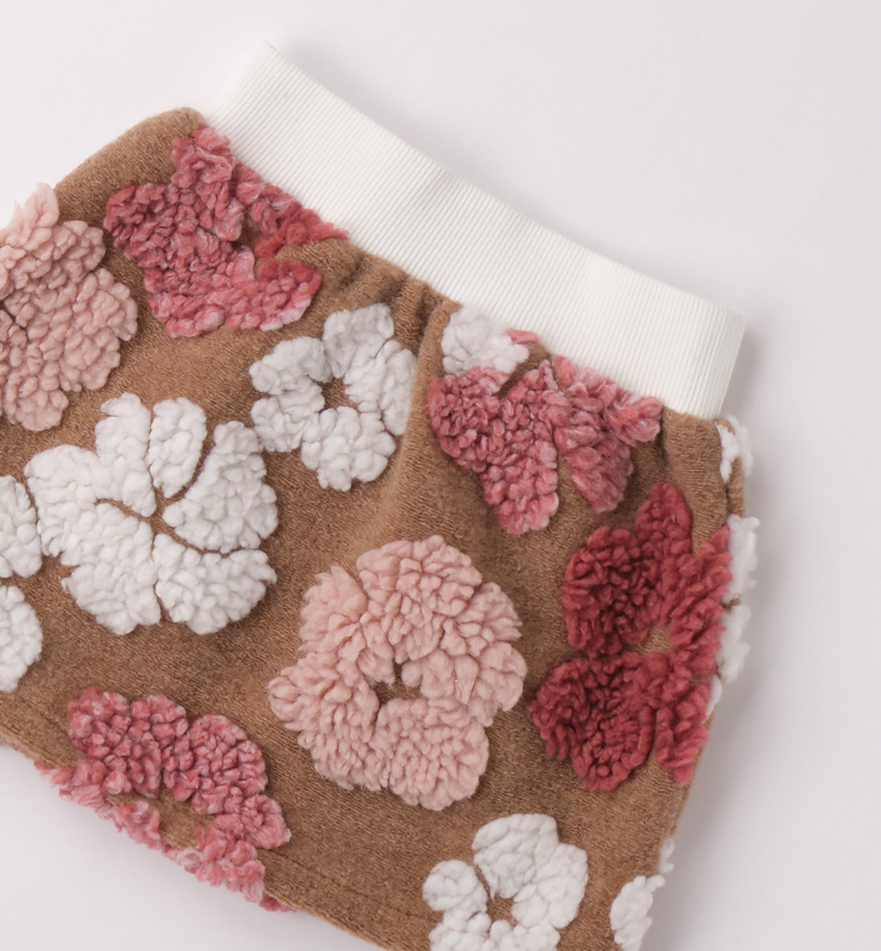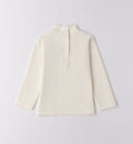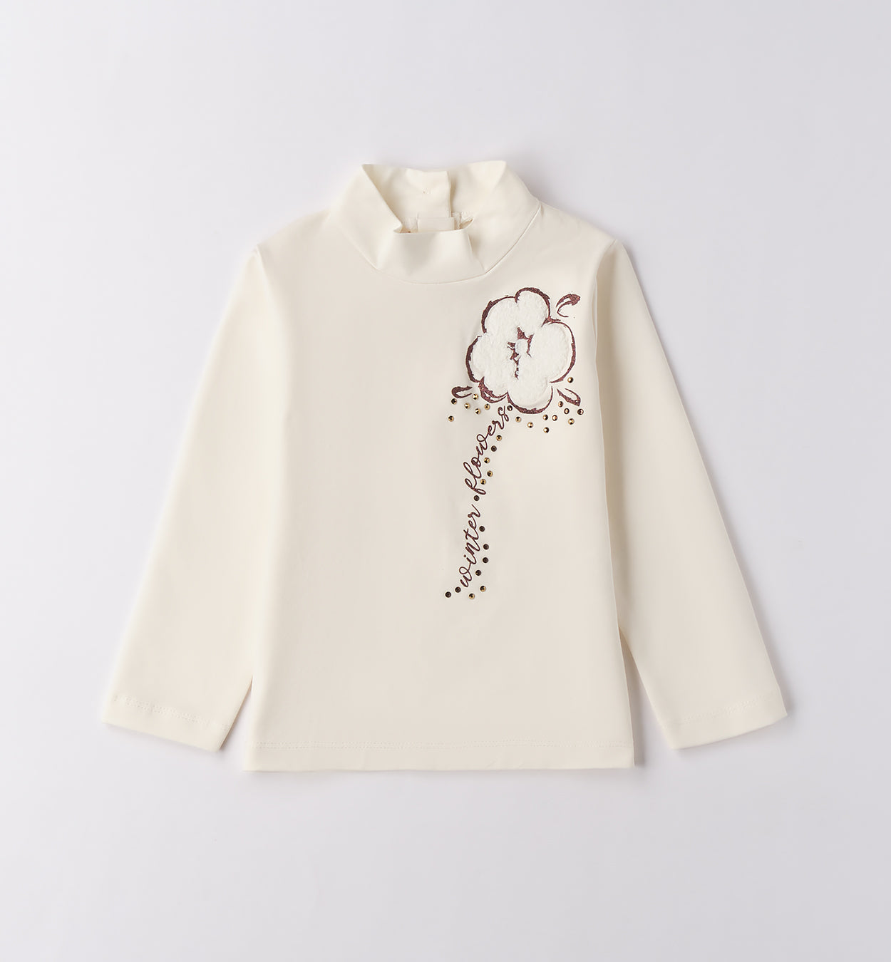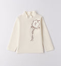 Completo bambina composto da dolcevita panna con ricamo floreale e scritta laterale, abbinato a gonna in tessuto con applicazioni floreali tridimensionali nei toni rosa, bianco e beige. Un look raffinato e originale, perfetto per cerimonie, feste e occasioni speciali.