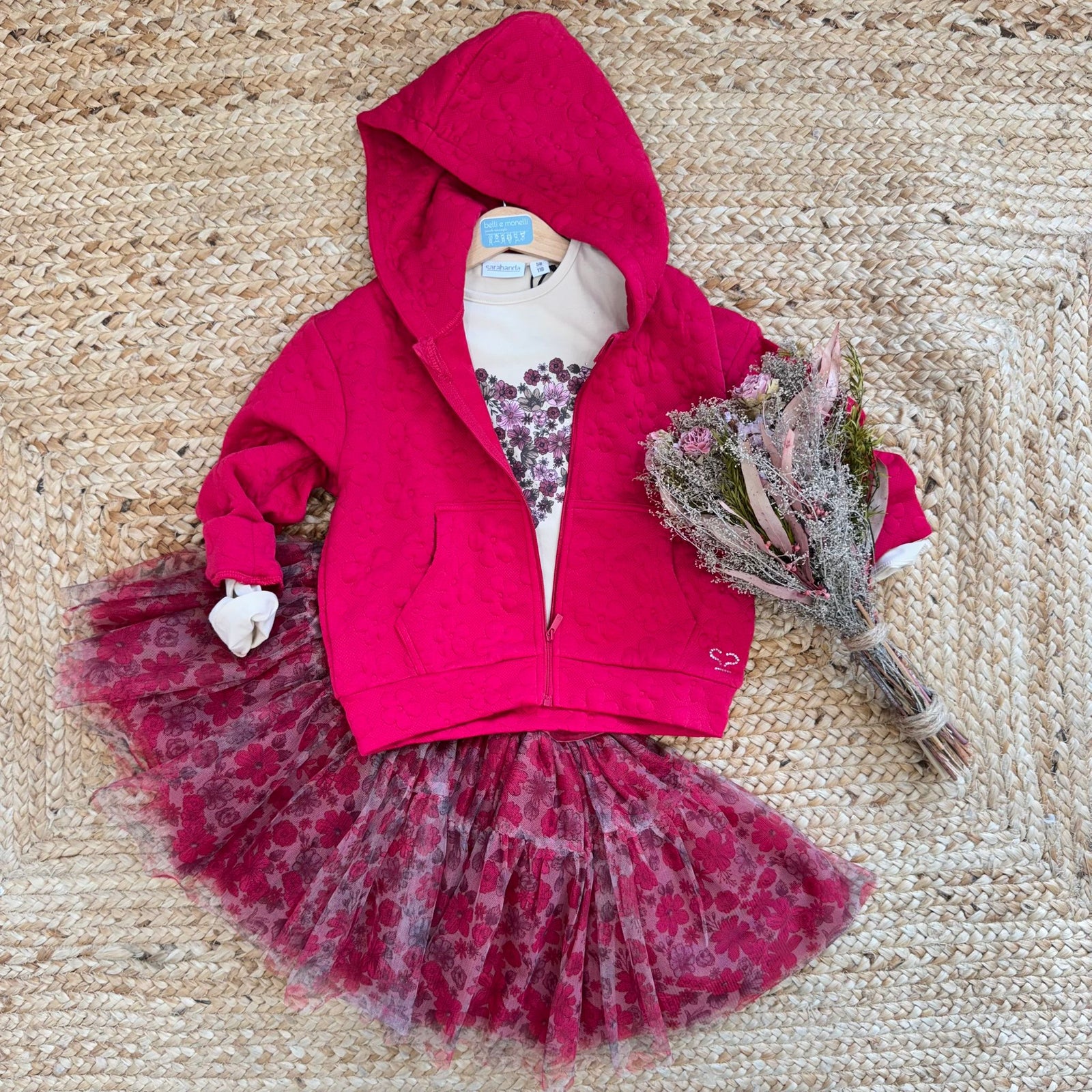 Completo bambina composto da felpa fucsia con cappuccio e tasche, t-shirt con cuore di fiori e gonna tutu in tulle a fantasia floreale tono su tono. Un look vivace e romantico, perfetto per dare colore e allegria agli outfit di stagione.