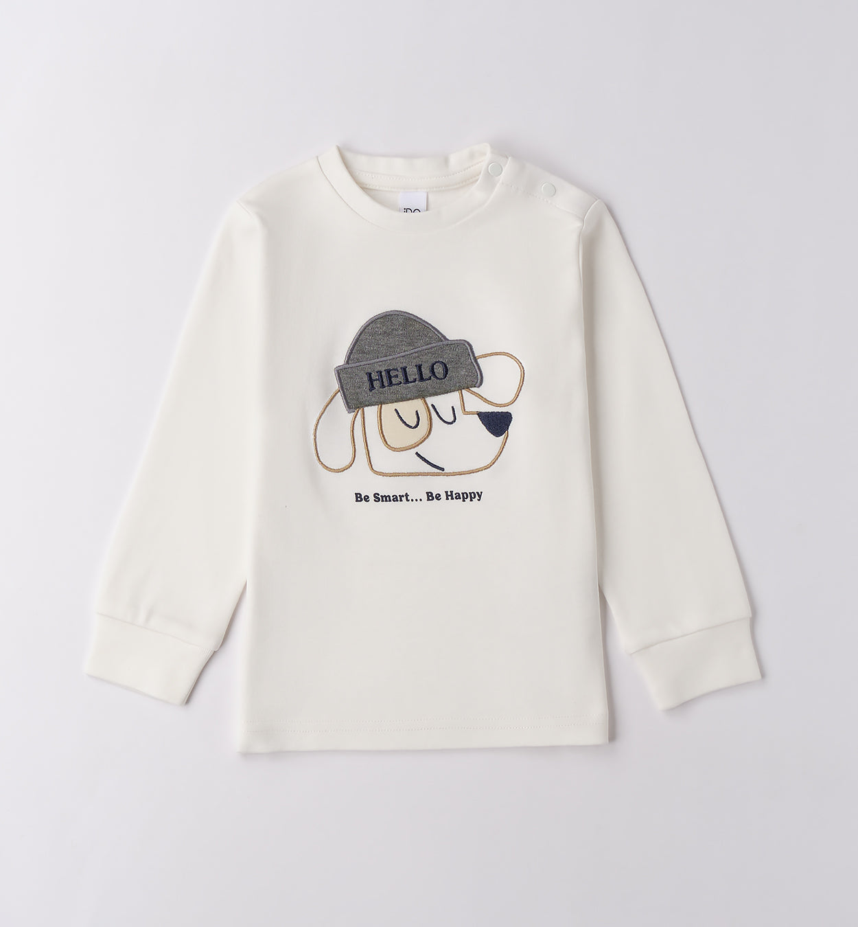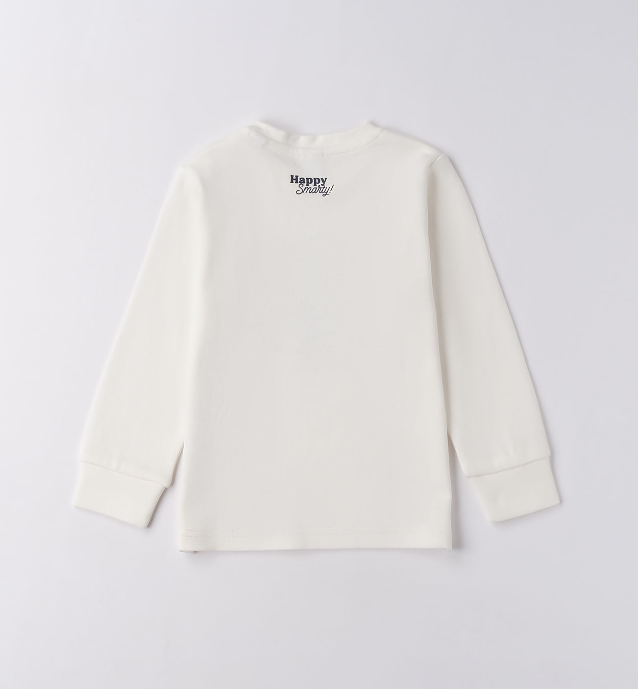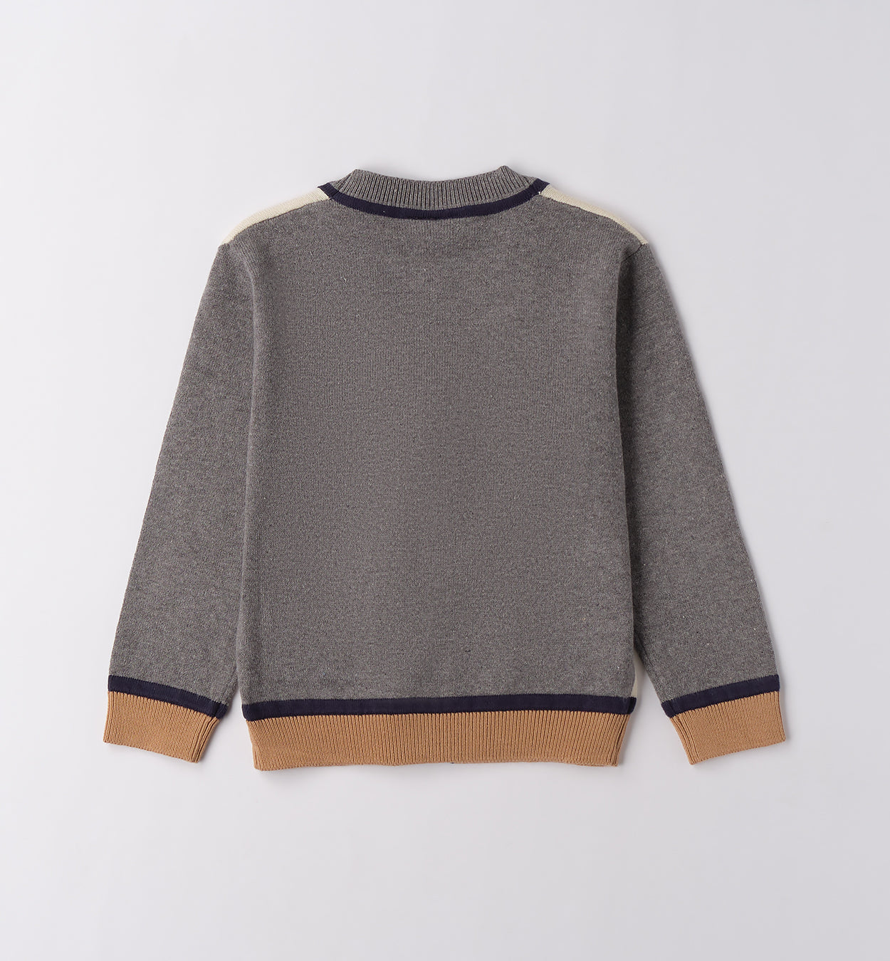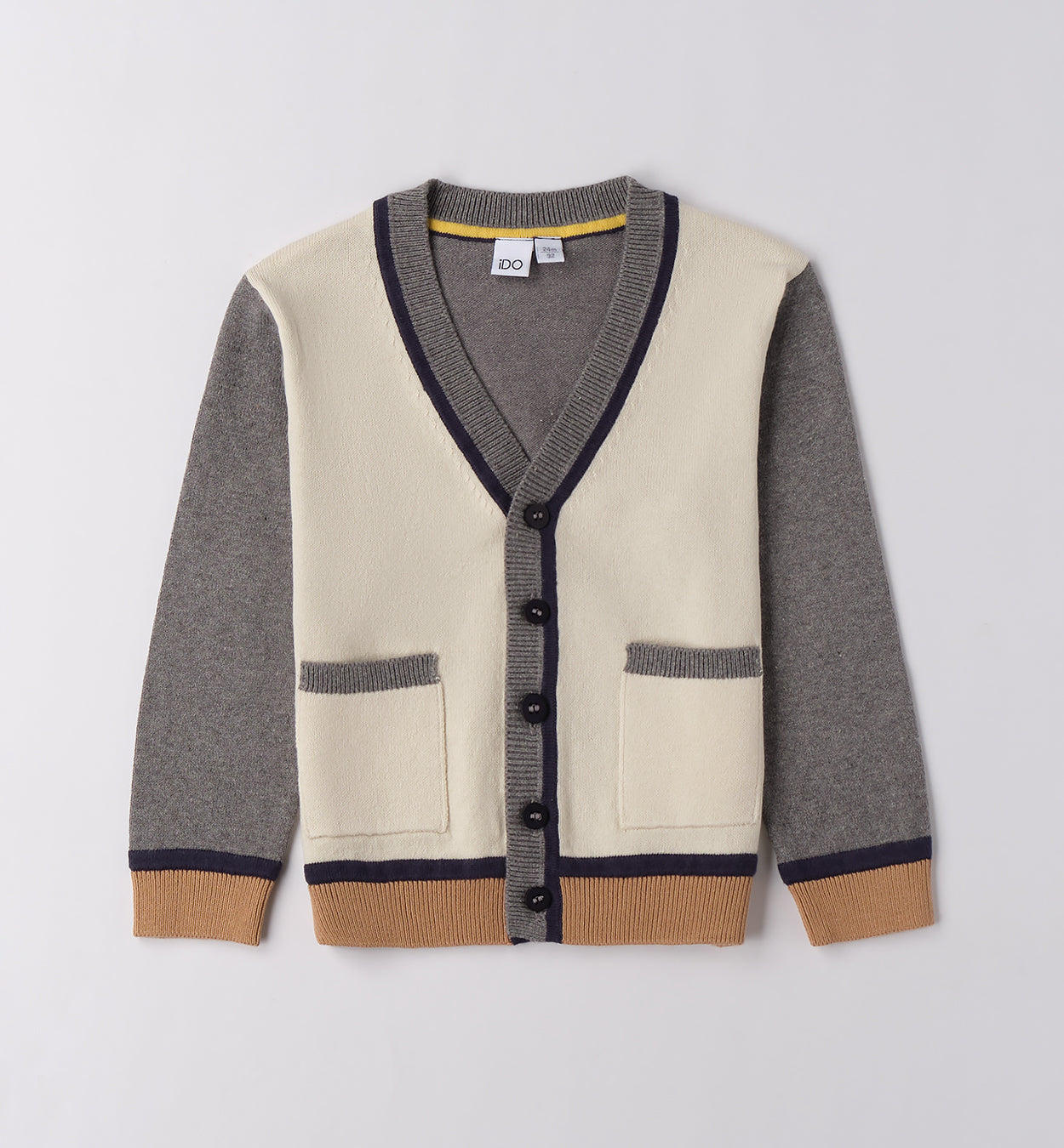 Completo bambino in caldo cotone composto da cardigan panna con maniche grigie e dettagli blu e beige, abbinato a t-shirt bianca con stampa giocosa. Un look casual chic che unisce comfort e stile, perfetto per scuola, tempo libero e occasioni speciali.