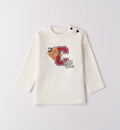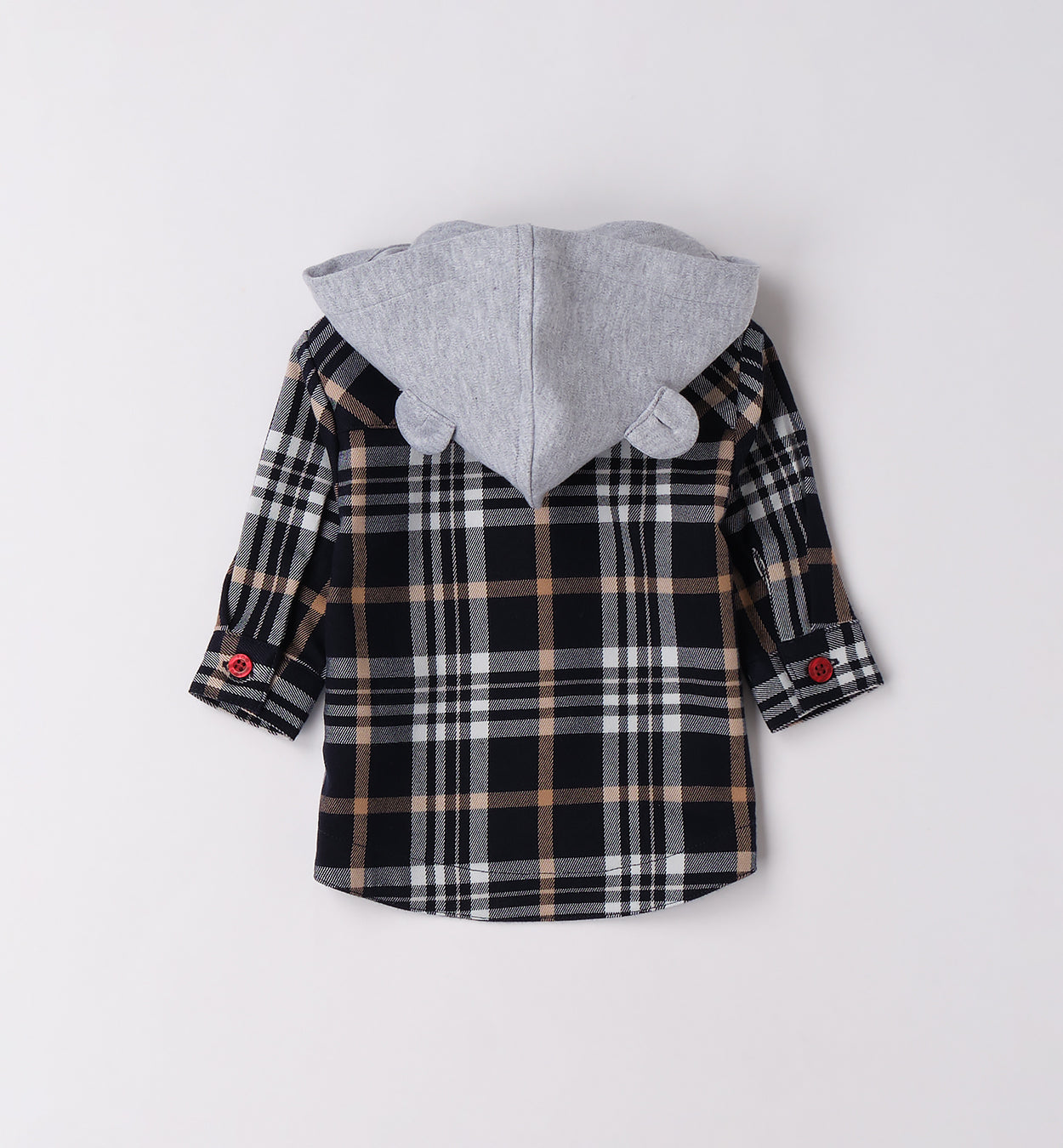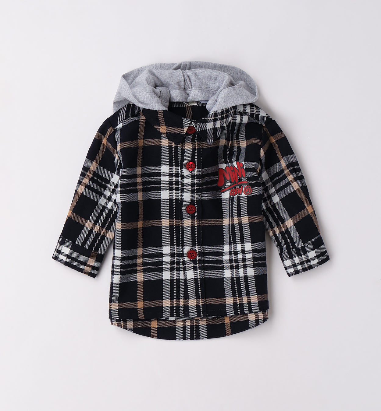 Completo bambino composto da t-shirt bianca stampata, camicia a quadri blu e beige con cappuccio grigio integrato e pantalone beige con elastico in vita. Un look trendy e comodo, perfetto per scuola, giochi e tempo libero.