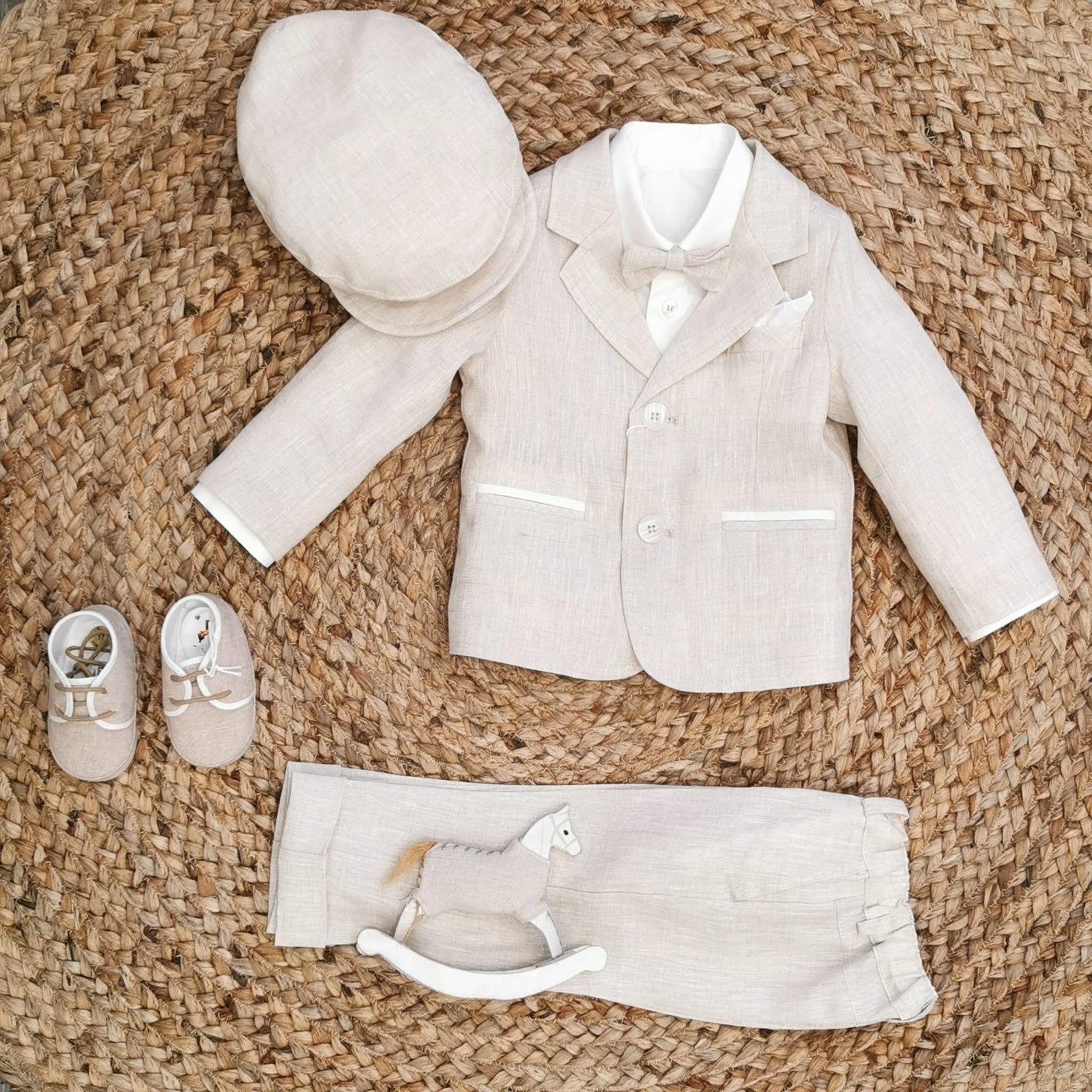 Raffinato completo per bambino in puro lino beige naturale, perfetto per battesimi, primi compleanni e cerimonie estive. Include giacca con tasche e papillon coordinato, camicia bianca, pantalone con elastico in vita e cappello abbinato. Tessuto fresco, leggero e ideale per le giornate importanti all’insegna dell’eleganza e del comfort.