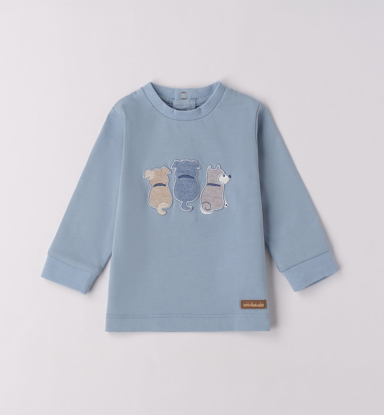 Completo bambino composto da maglia azzurra a maniche lunghe con ricamo cuccioli e pantalone jogger blu con tasche cargo. Un look pratico e confortevole, perfetto per la scuola e il tempo libero.