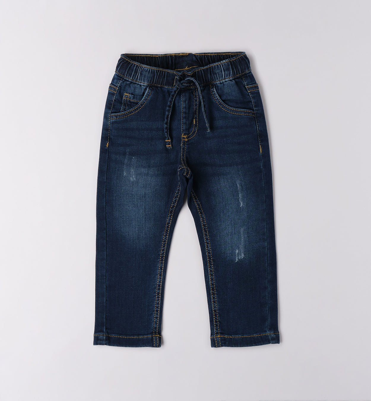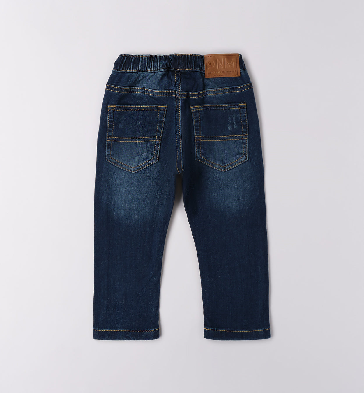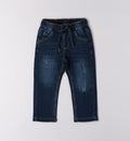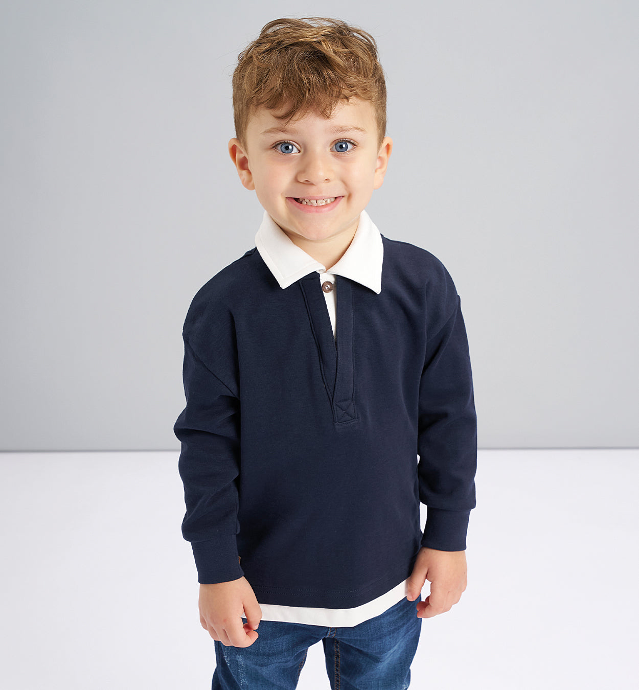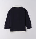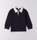 Completo bambino con polo blu a maniche lunghe, colletto bianco e abbottonatura frontale, abbinato a jeans in denim blu. Un coordinato casual chic, pratico e versatile, perfetto per scuola, tempo libero e occasioni informali.