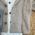 Raffinato completo da battesimo per bimbo composto da camicia bianca in cotone, cardigan grigio con lavorazione a trecce e bottoni tono su tono, pantalone in tessuto morbido grigio chiaro e papillon coordinato. Perfetto per cerimonie eleganti .