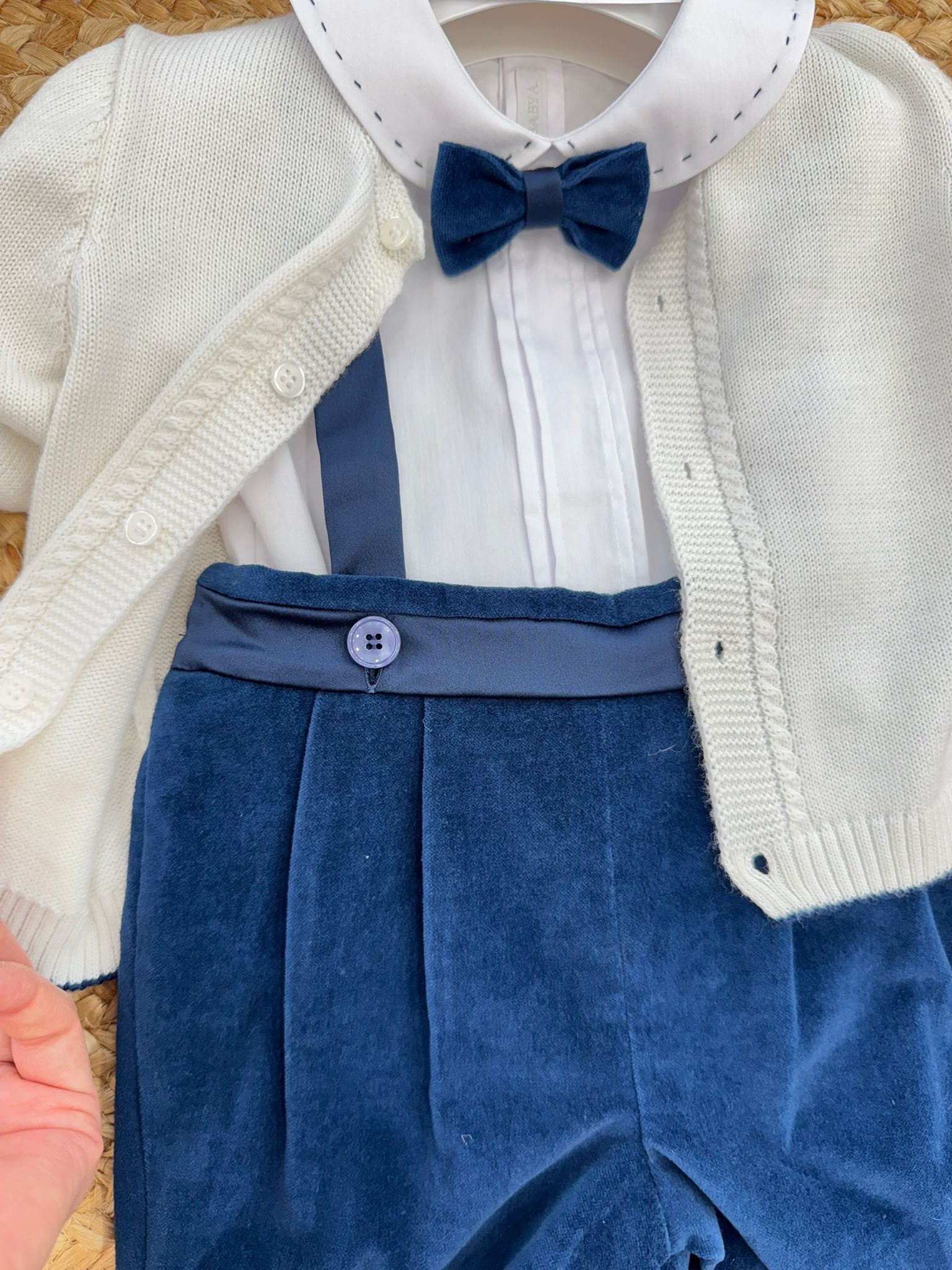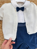 Elegante completo per Battesimo neonato composto da camicia-body bianca con colletto ricamato, papillon in velluto blu e cardigan panna in maglia fine. Pantaloncini corti in velluto blu con bretelle applicate completano l’outfit, donando raffinatezza e comfort. Un coordinato ricercato, perfetto per il Battesimo e le prime cerimonie. Che ci crediate o no, i vostri bambini cambieranno il mondo.