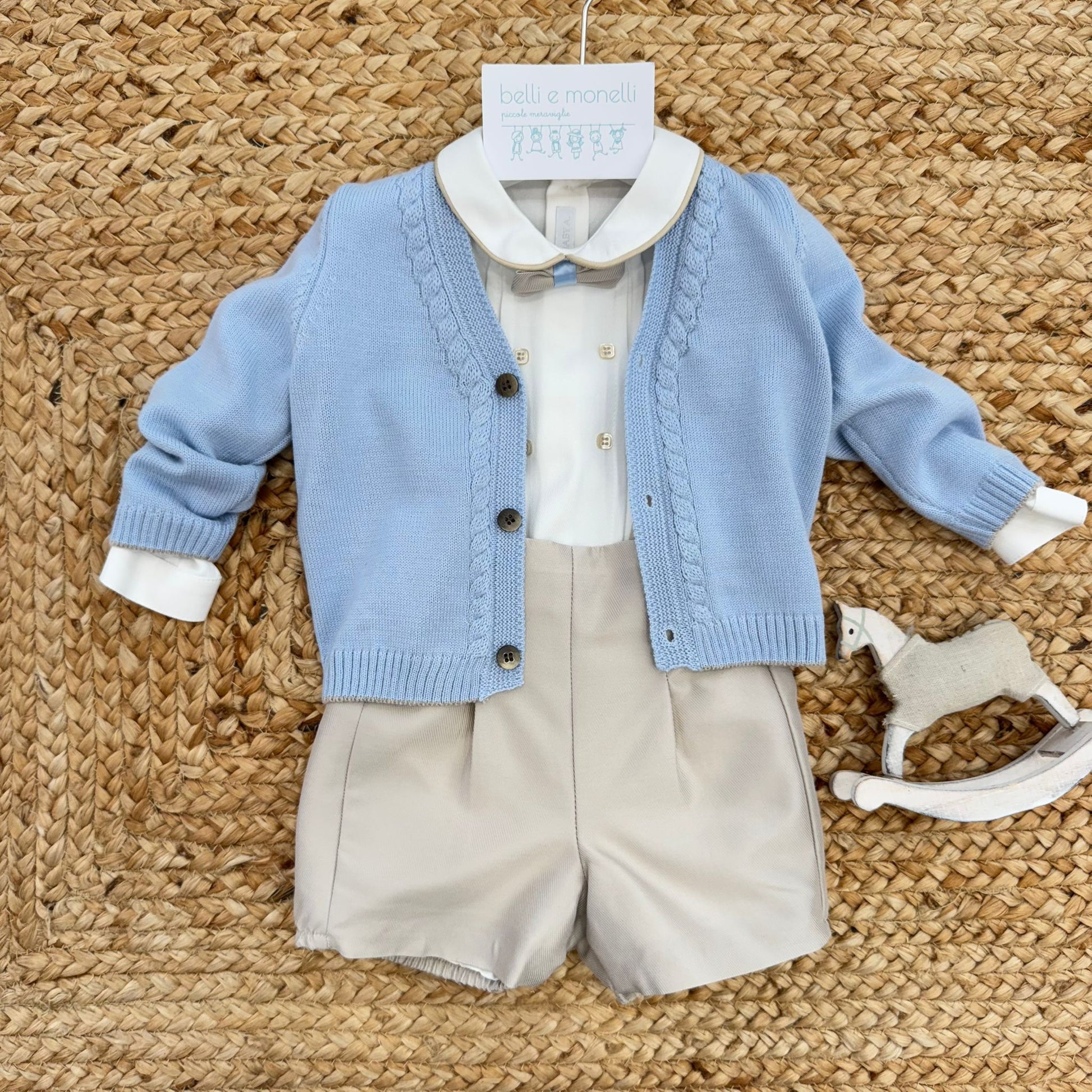 Raffinato completo per Battesimo neonato composto da camicia-body bianca con bottoni decorativi e papillon tortora con dettaglio celeste, cardigan azzurro cielo lavorato a trecce e pantaloncini beige con bretelle coordinate. Un outfit elegante e confortevole, ideale per Battesimo e prime cerimonie speciali. Che ci crediate o no, i vostri bambini cambieranno il mondo.