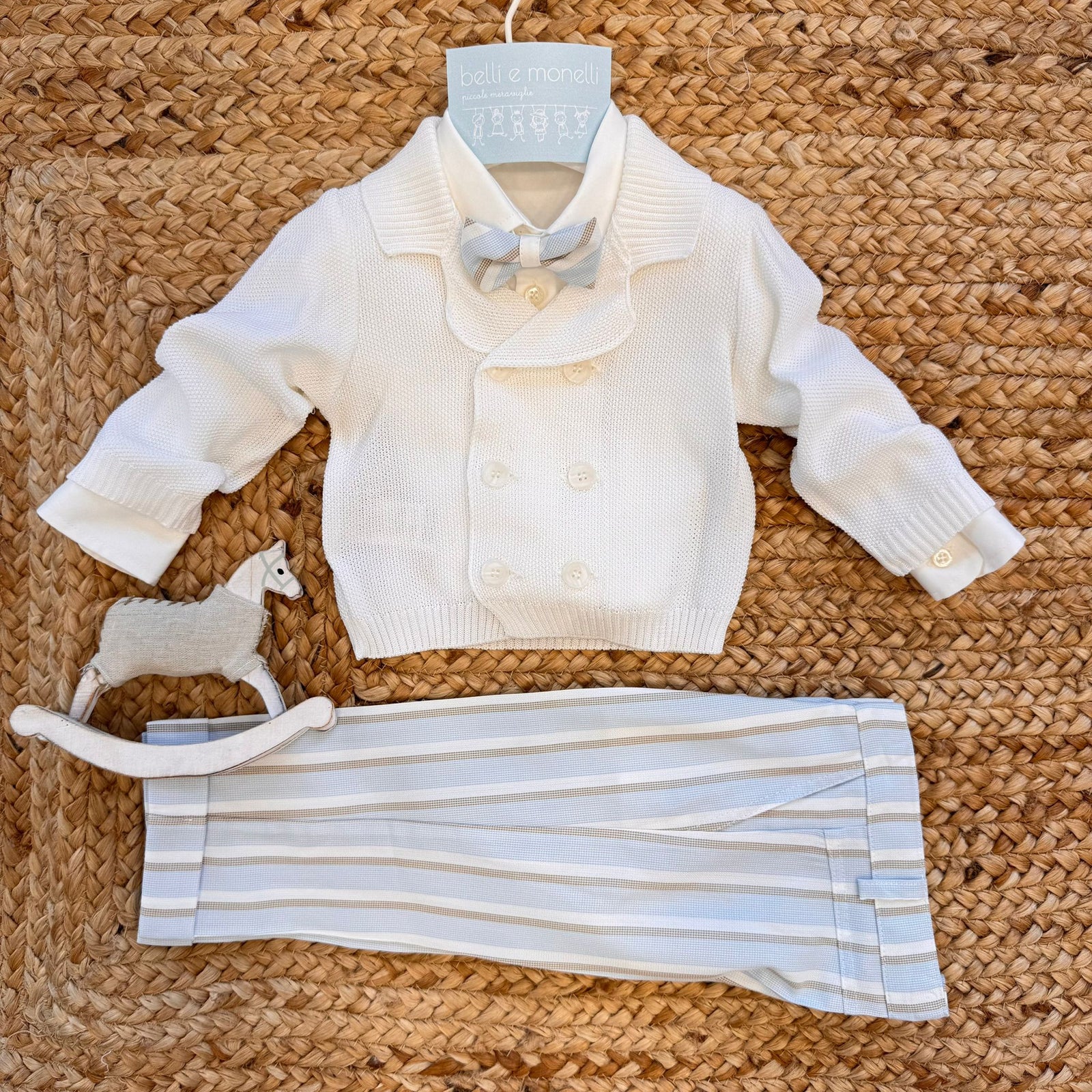 Elegante completo da battesimo per neonato in lino e cotone, composto da pantaloni a righe panna e celeste, camicia, giacca doppiopetto lavorata a maglia e papillon coordinato. Un set nascita e cerimonia raffinato, curato nei dettagli sartoriali per offrire stile e comfort al tuo bambino.