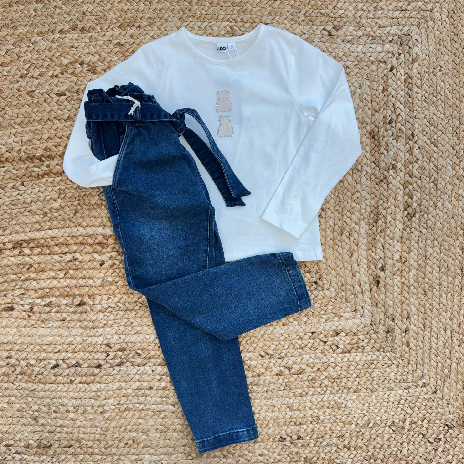 Completo bimba composto da maglia bianca a manica lunga con dolce dettaglio orsetto e jeans in denim blu con cintura coordinata. Un outfit pratico e versatile, perfetto per ogni giorno e ideale per il periodo Black Friday.