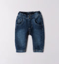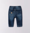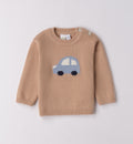 Completo casual chic per bimbo composto da maglioncino beige in cotone con motivo auto celeste e pantalone in denim blu elasticizzato. Un outfit comodo e di tendenza, perfetto per le giornate speciali e il tempo libero con un tocco giocoso ed elegante.