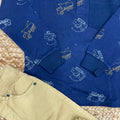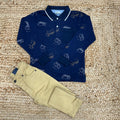 Completo bimbo composto da polo blu con stampa mezzi da lavoro e pantalone beige coordinato. Un look pratico e curato, perfetto per la scuola e il tempo libero.