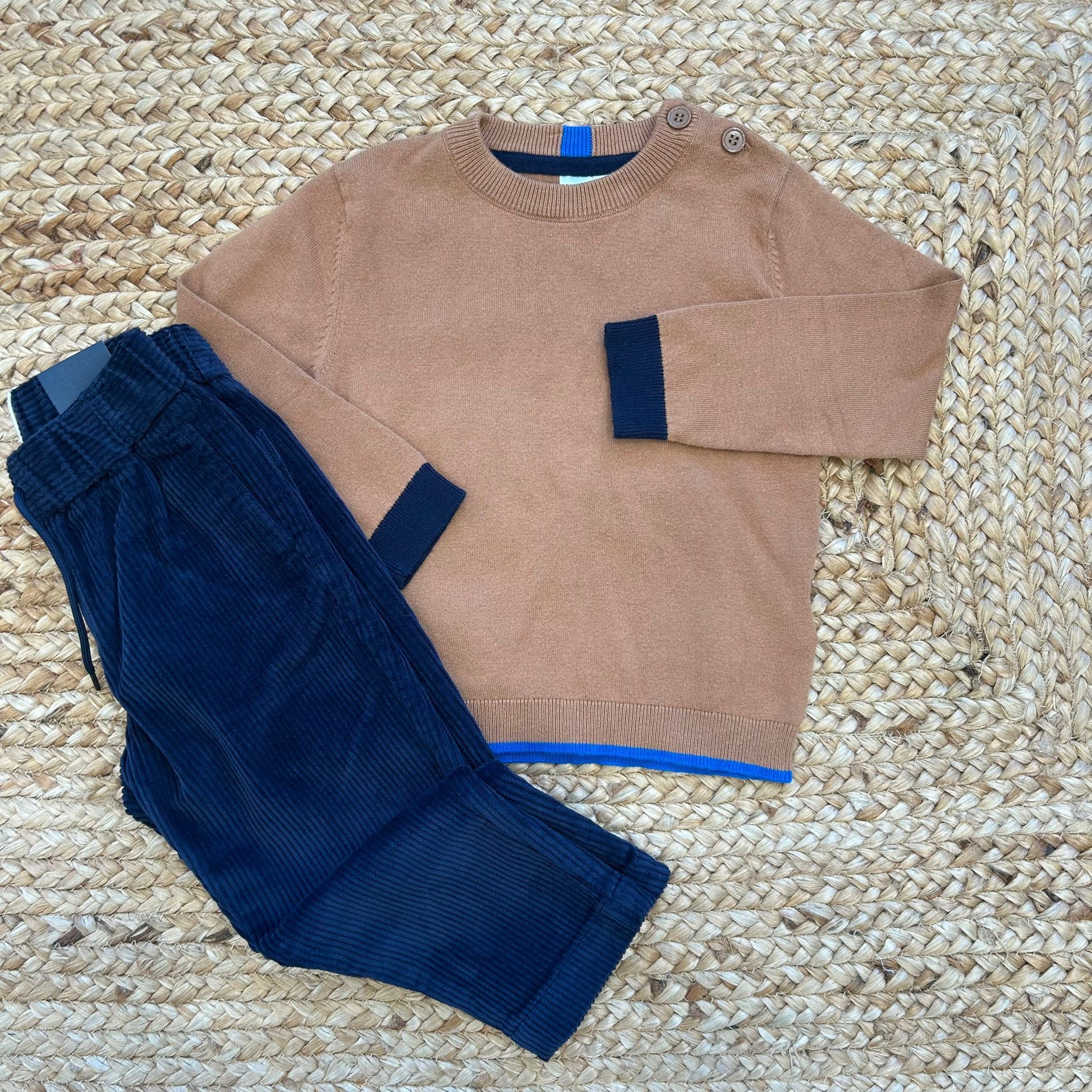 Completo bimbo composto da maglioncino color cammello con dettagli blu navy su polsini e bordo, abbinato a pantalone in velluto blu. Un outfit caldo, pratico e curato nei dettagli, perfetto per la stagione più fredda e ideale per ogni occasione.