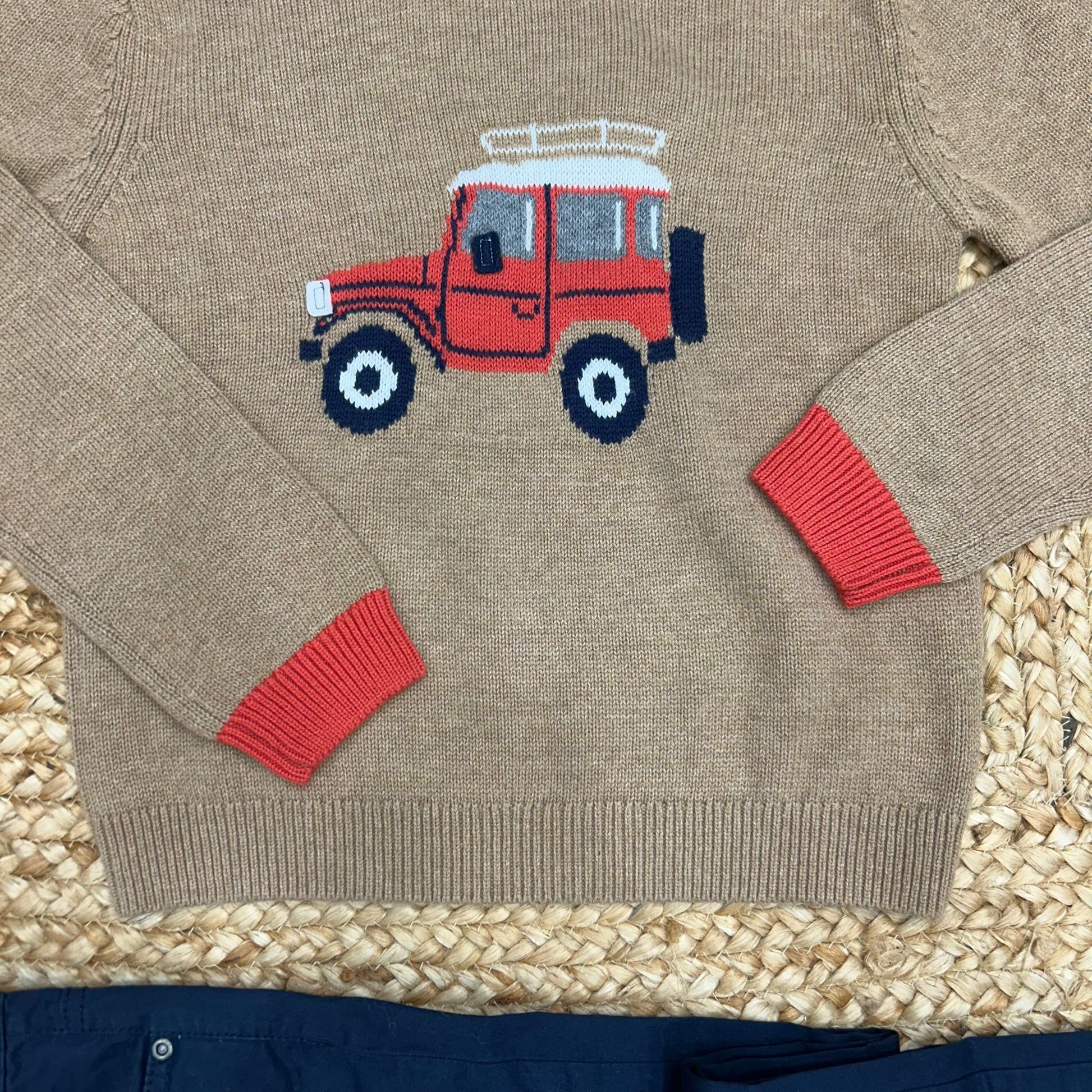 Completo bimbo composto da maglia color cammello con ricamo jeep rossa e pantalone blu coordinato. Un outfit pratico e grintoso, perfetto per la scuola o il tempo libero.