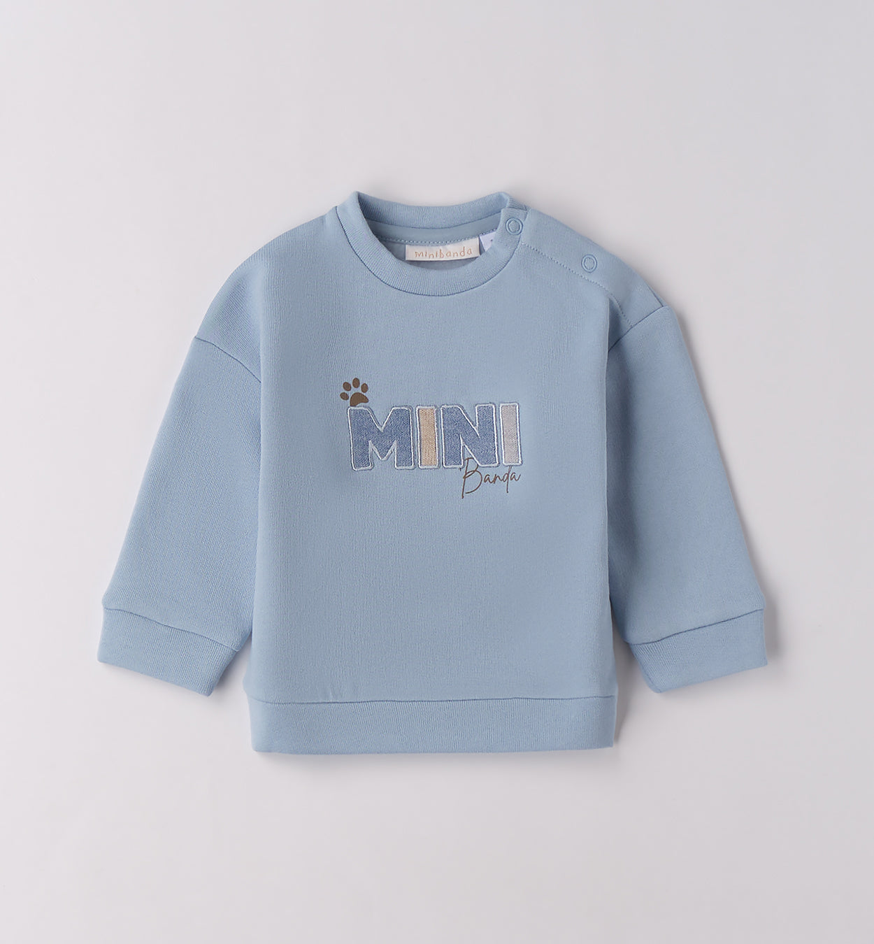 Completo bimbo composto da felpa azzurra con scritta “MINI” ricamata e pantaloni jogger blu con tasconi laterali. Un outfit pratico e confortevole, perfetto per il tempo libero, la scuola e le giornate di gioco grazie al tessuto morbido e funzionale.