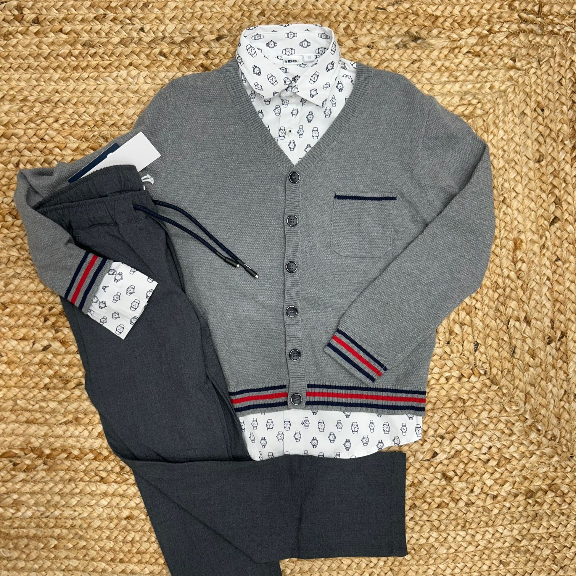 Completo bimbo elegante composto da cardigan grigio con dettagli blu e rossi, camicia bianca stampata e pantalone grigio coordinato. Un look raffinato e comodo, ideale per cerimonie o occasioni speciali.
