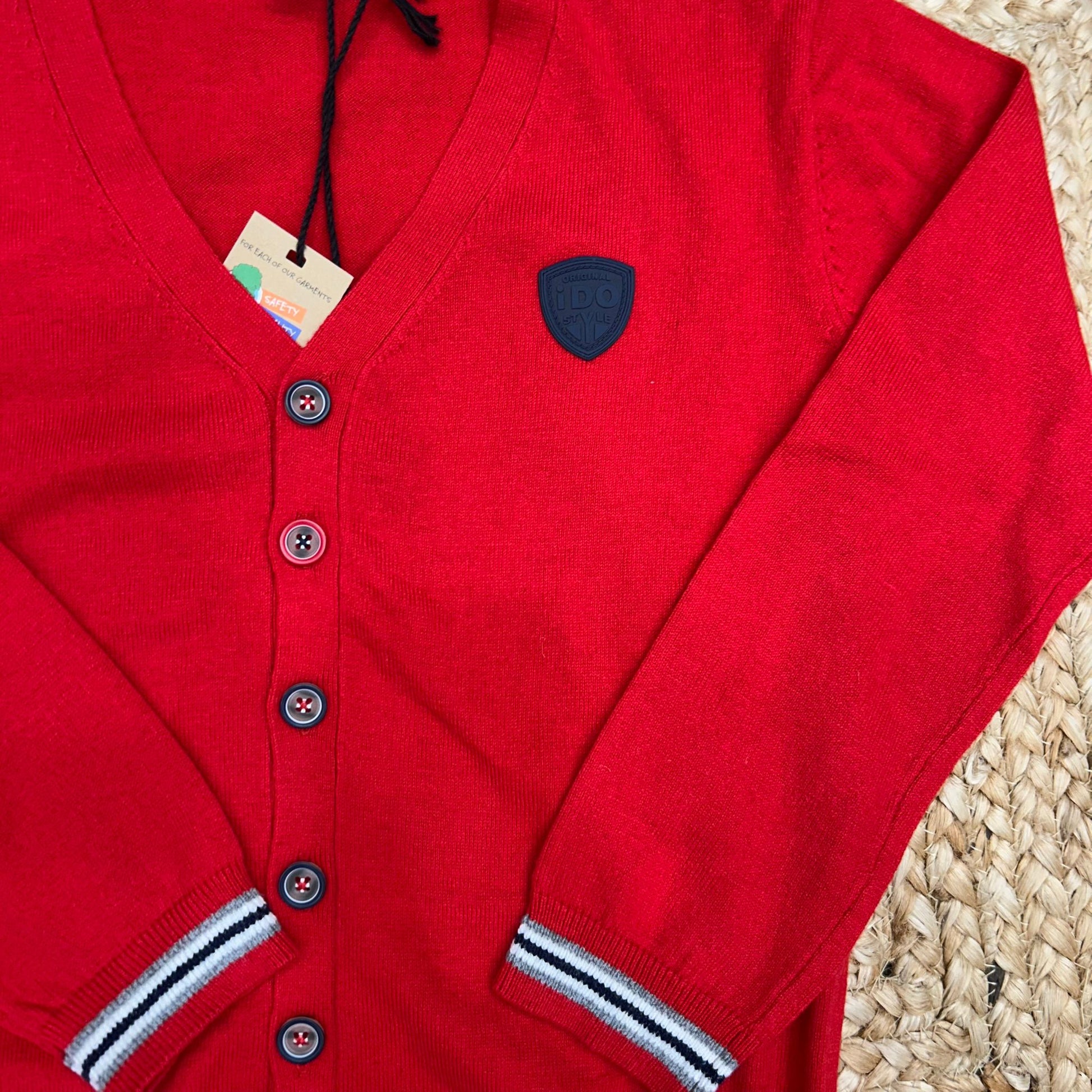 Completo bimbo composto da cardigan rosso con profili a righe sui bordi e pantalone blu in tessuto vellutato. Un look raffinato ma confortevole, perfetto per le giornate speciali o per uno stile curato anche nel tempo libero.