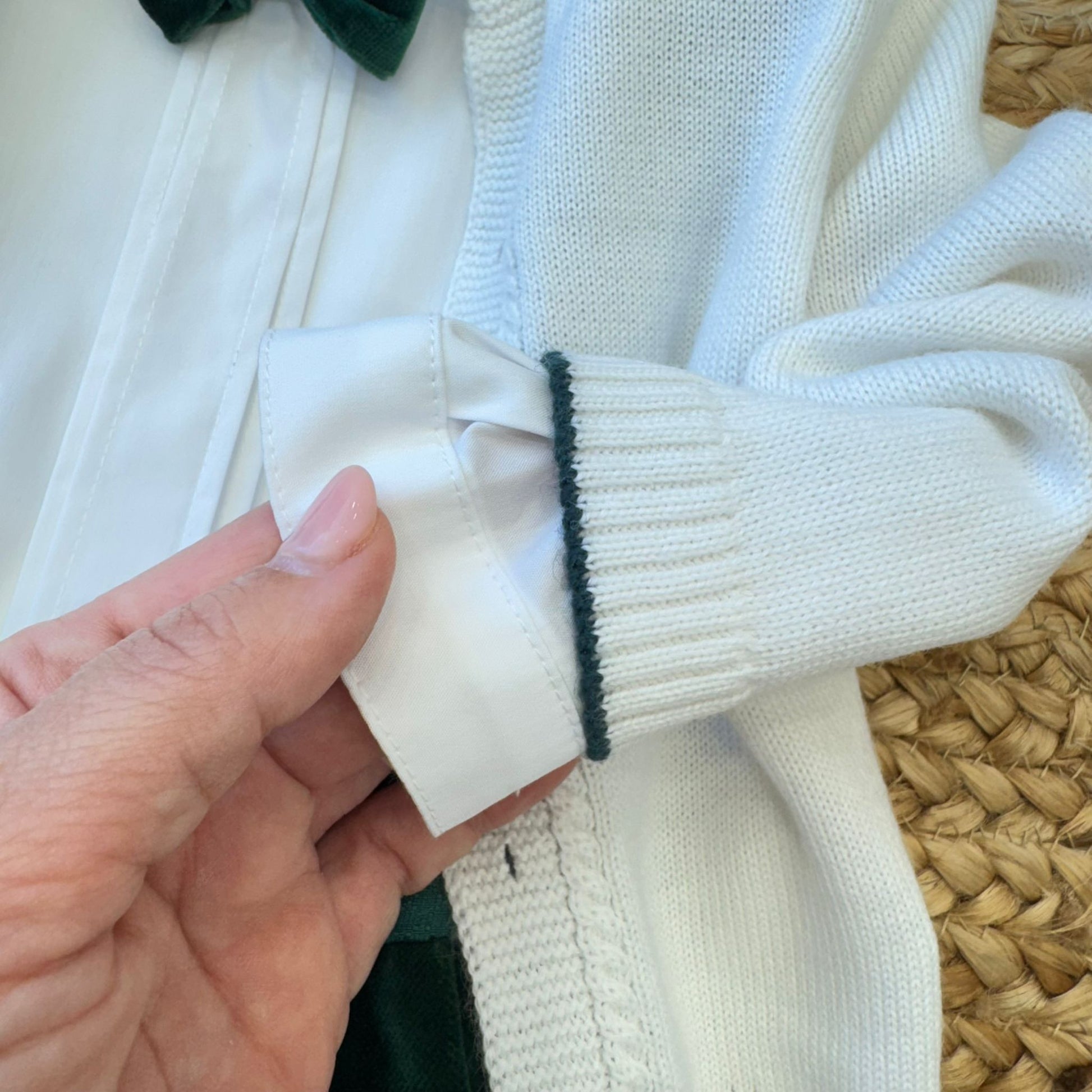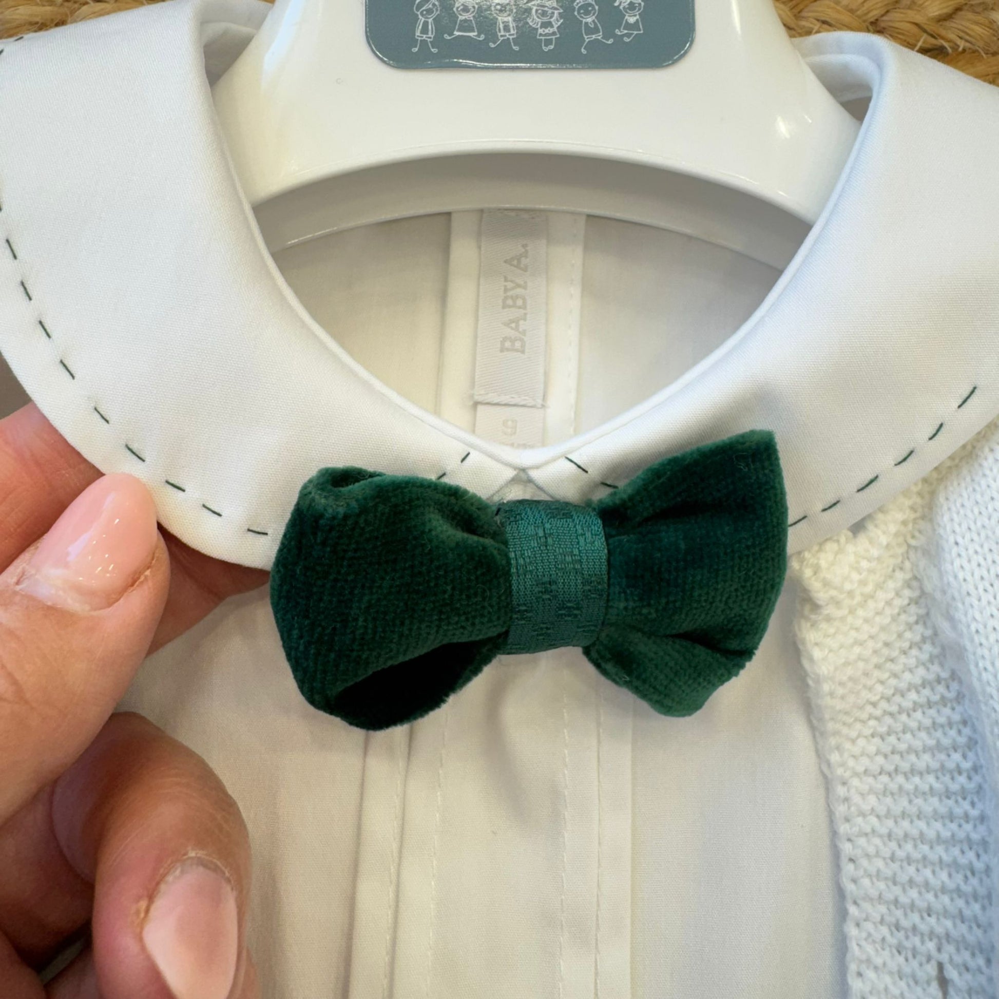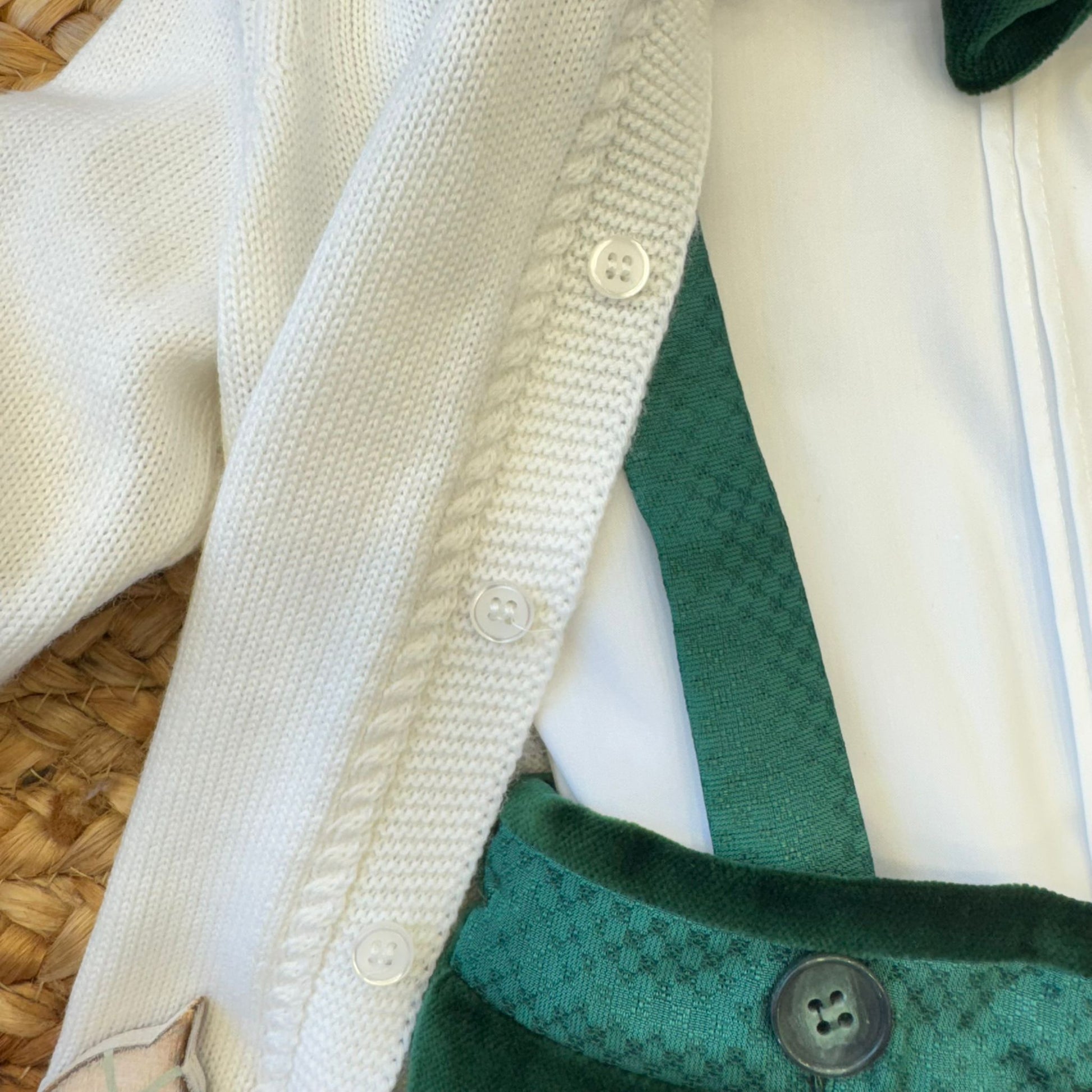 Elegante completo bimbo composto da camicia bianca con papillon in velluto verde bottiglia, pantaloncini con bretelle coordinate e cardigan panna con profilo verde. Un outfit raffinato, perfetto per cerimonie, feste o momenti speciali. Le bretelle regolabili e i dettagli sartoriali donano stile e comfort a ogni movimento.