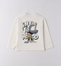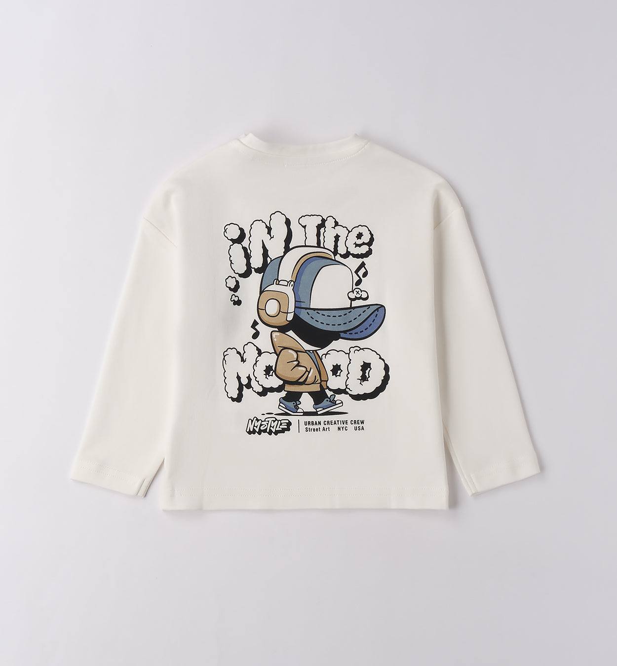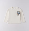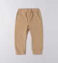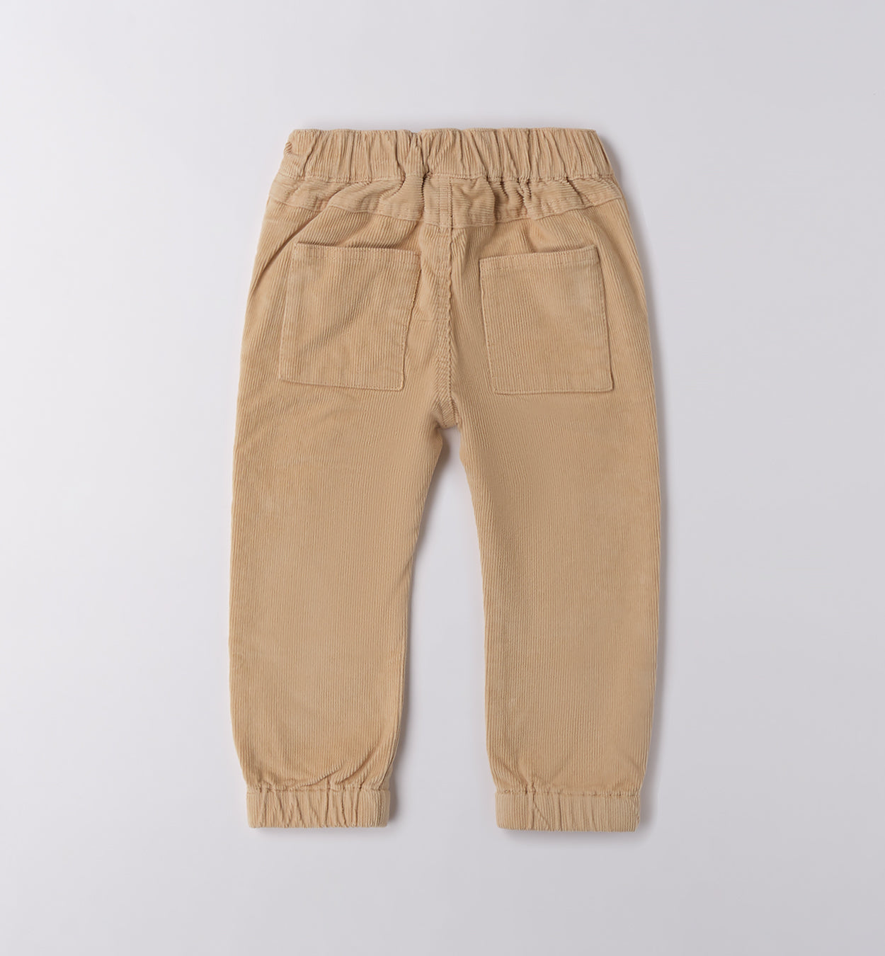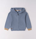 Completo casual chic per bimbo composto da felpa azzurra con cappuccio e polsini beige, t-shirt bianca basic e pantaloni in velluto a coste beige con taschino. Un look pratico e stiloso, ideale per la scuola, le passeggiate e il tempo libero.
