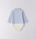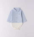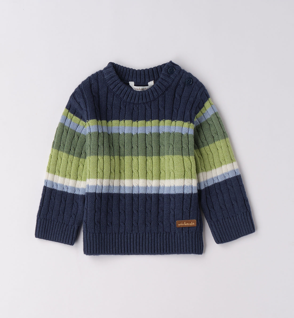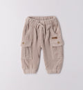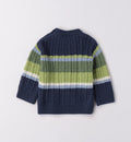 Completo casual chic per bimbo composto da maglia navy in maglia intrecciata con righe verdi e azzurre, camicia azzurra sottostante e pantaloni in velluto a coste beige con tasconi laterali. Un outfit raffinato e confortevole, perfetto per la scuola e le uscite in famiglia.
