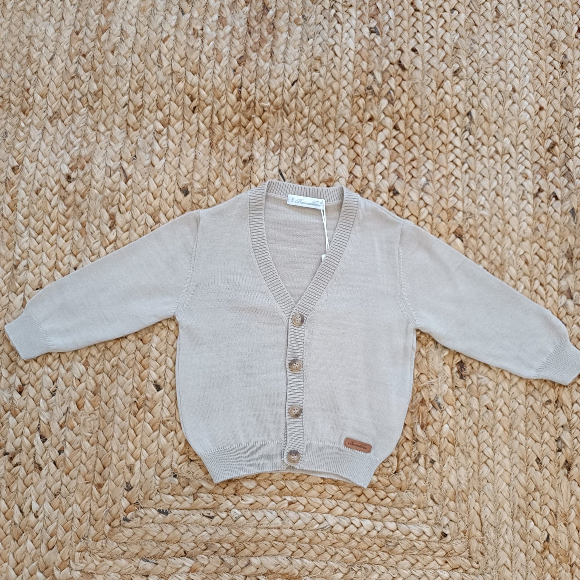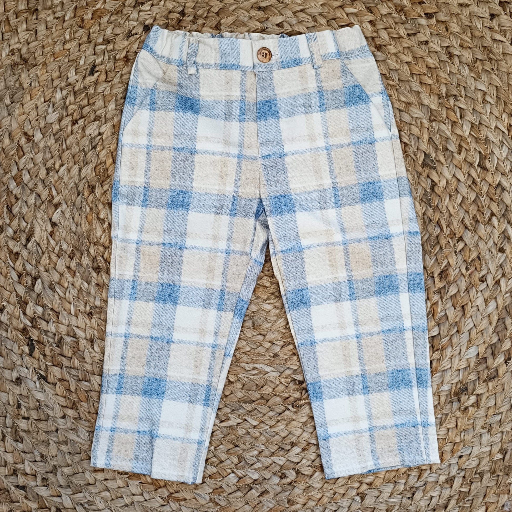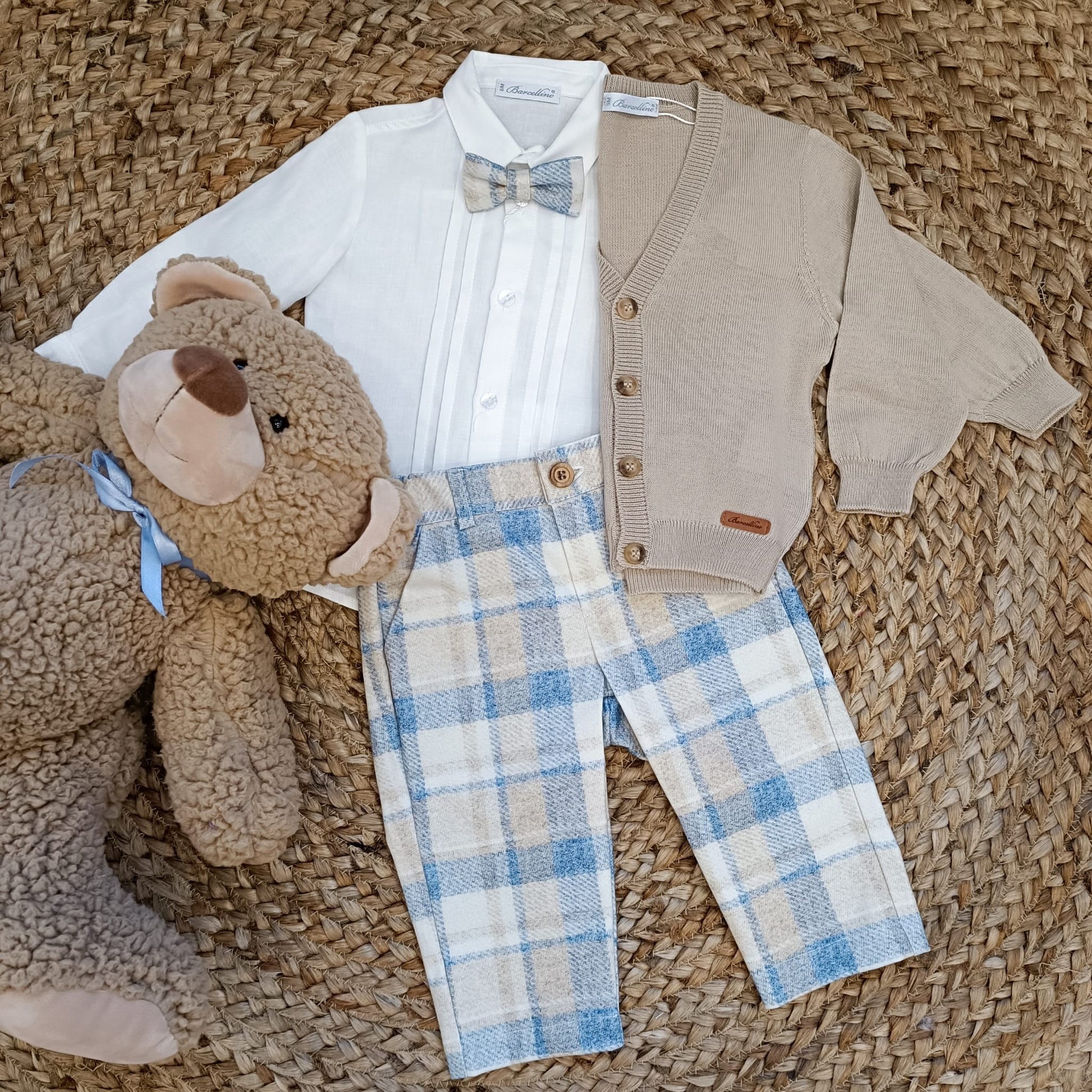 Il completo per bambino è l'ideale per tenere il tuo piccolo al caldo con stile durante la stagione fredda. Questo outfit include pantaloni in misto lana con un delicato motivo a quadretti azzurro e beige, perfetti per occasioni speciali o per un look quotidiano raffinato. Il set è completato da un cardigan in lana beige, morbido e confortevole, dotato di bottoni decorativi che ne facilitano l'indosso. Un papillon abbinato aggiunge un tocco di charme, rendendo il completo particolarmente adatto per eventi festivi o riunioni di famiglia. Questo completo non solo è bello da vedere, ma è anche funzionale, mantenendo il tuo bambino caldo e comodo tutto il giorno.