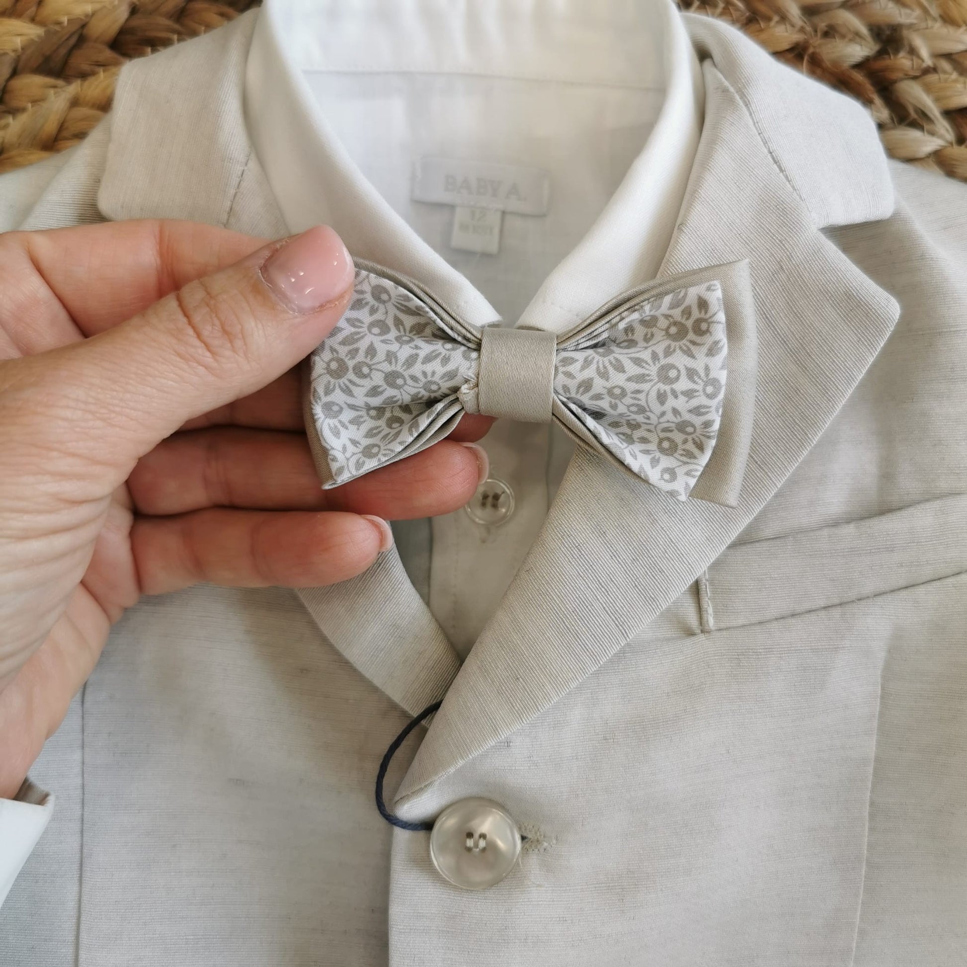 Regala un tocco di classe e raffinatezza a un giorno speciale con questo completo da Battesimo in shantung, pensato per le occasioni più importanti. Il set include una giacca strutturata con bottoni eleganti, pantalone coordinato, camicia in cotone e un papillon con fantasia delicata. Il tessuto shantung dona un effetto luminoso e sofisticato, perfetto per cerimonie e feste.
