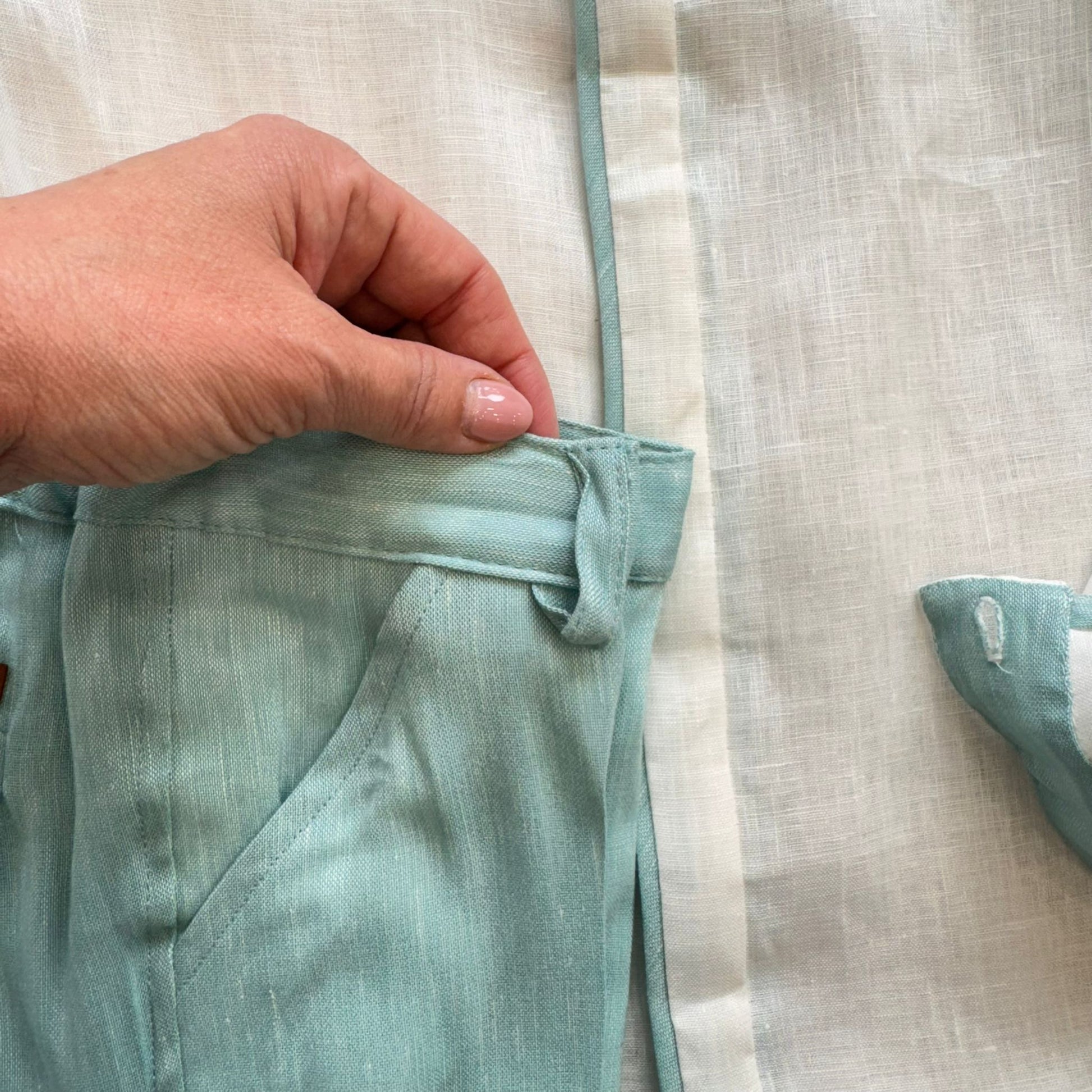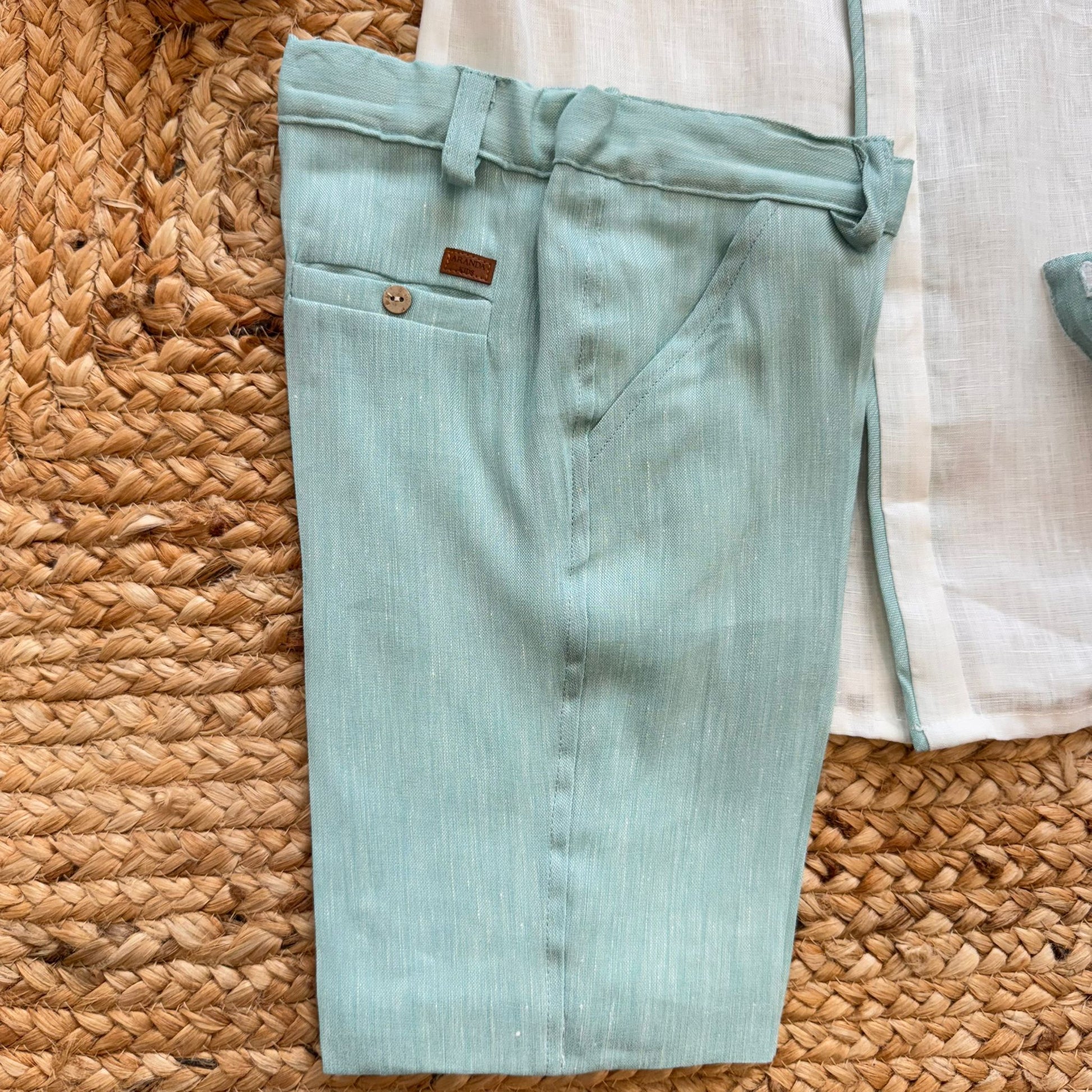 Completo elegante da bimbo in puro lino, con camicia bianca impreziosita da dettagli celeste polvere e pantalone coordinato. Fresco, leggero e raffinato, è ideale per battesimo, cerimonia o occasioni speciali. Taglio sartoriale, stile romantico e sobrio, pensato per vestire i bambini con delicatezza e gusto. Made in Italy.