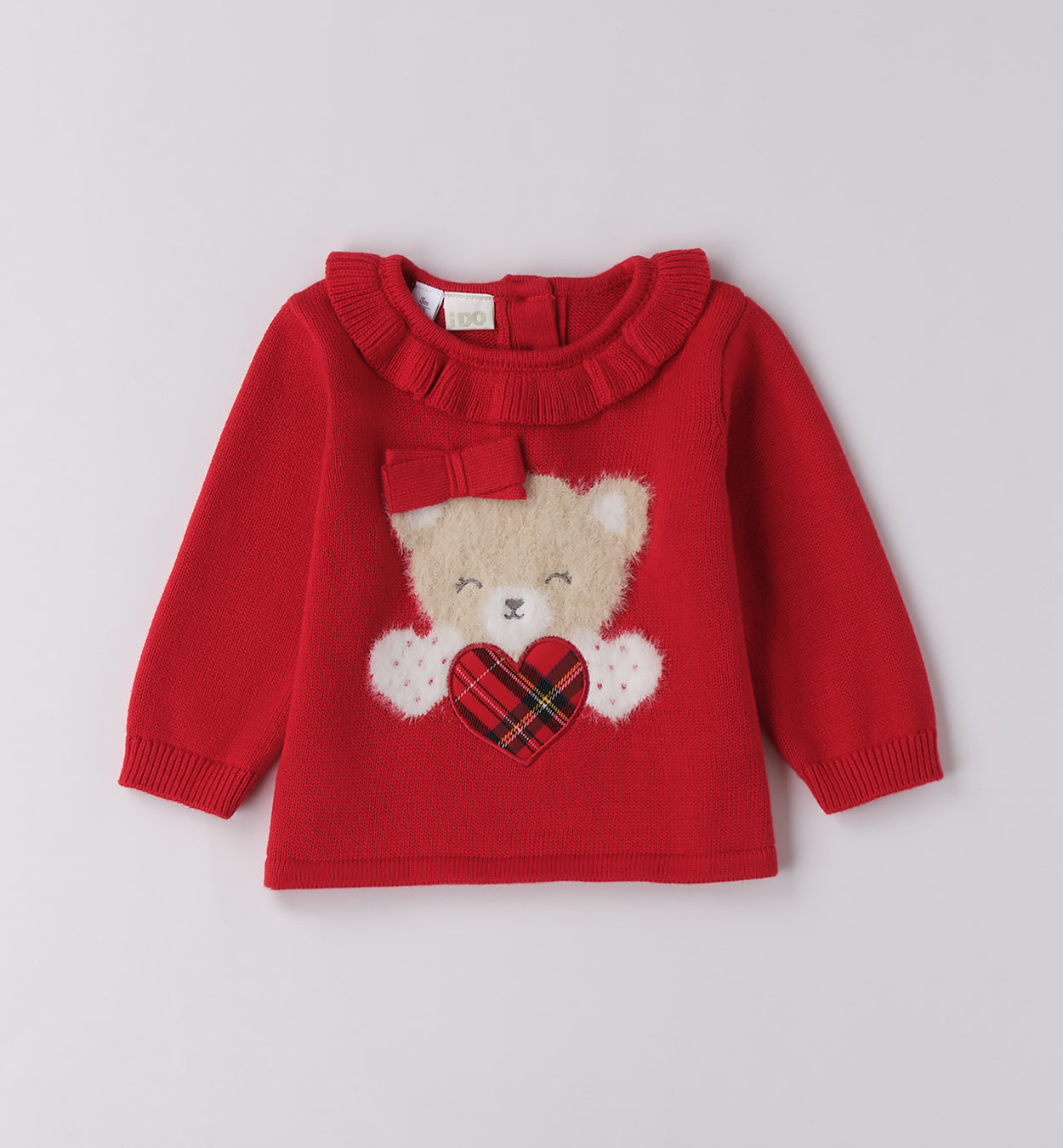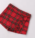 Completo natalizio per bimba con maglioncino rosso in maglia decorato da un tenero orsetto con cuore tartan e fiocchetto, abbinato a gonnellina scozzese con ruches laterali. Morbido, elegante e perfetto per le feste o le foto di Natale.