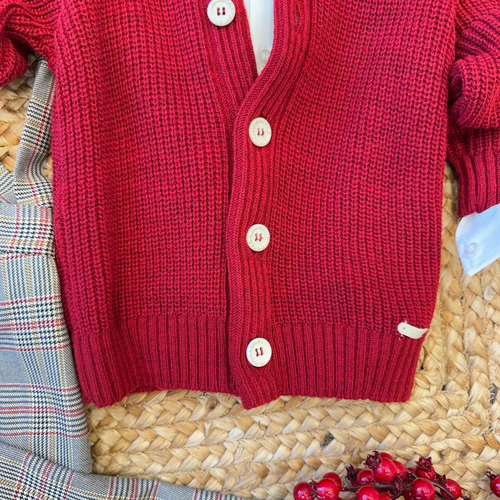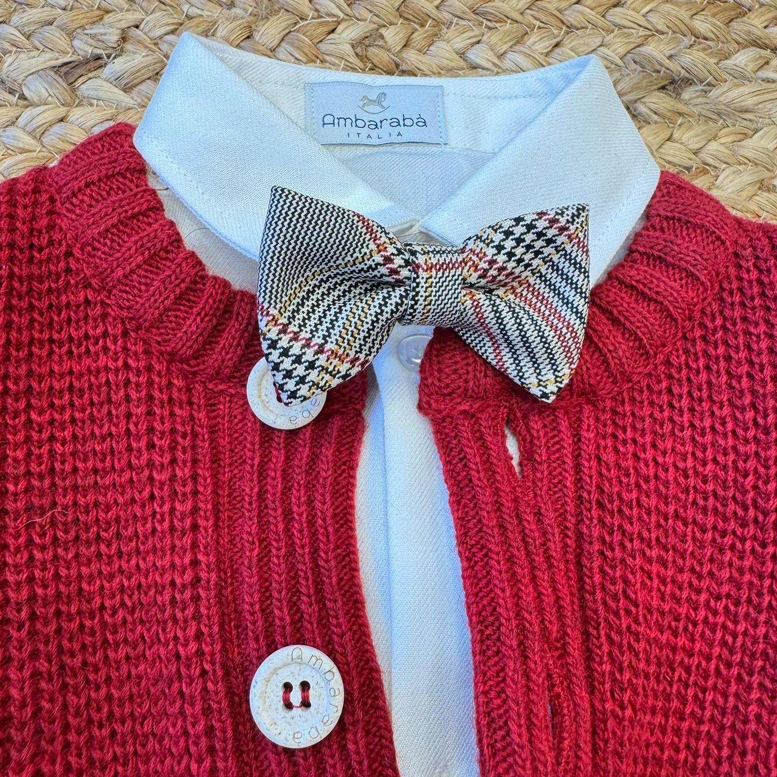 Completo natalizio per bimbo composto da camicia bianca, pantaloni a quadri con bretelle e cardigan bordeaux in maglia. Il papillon coordinato completa un look elegante e confortevole, perfetto per feste, foto di Natale o cerimonie invernali. Stile classico dal fascino senza tempo.