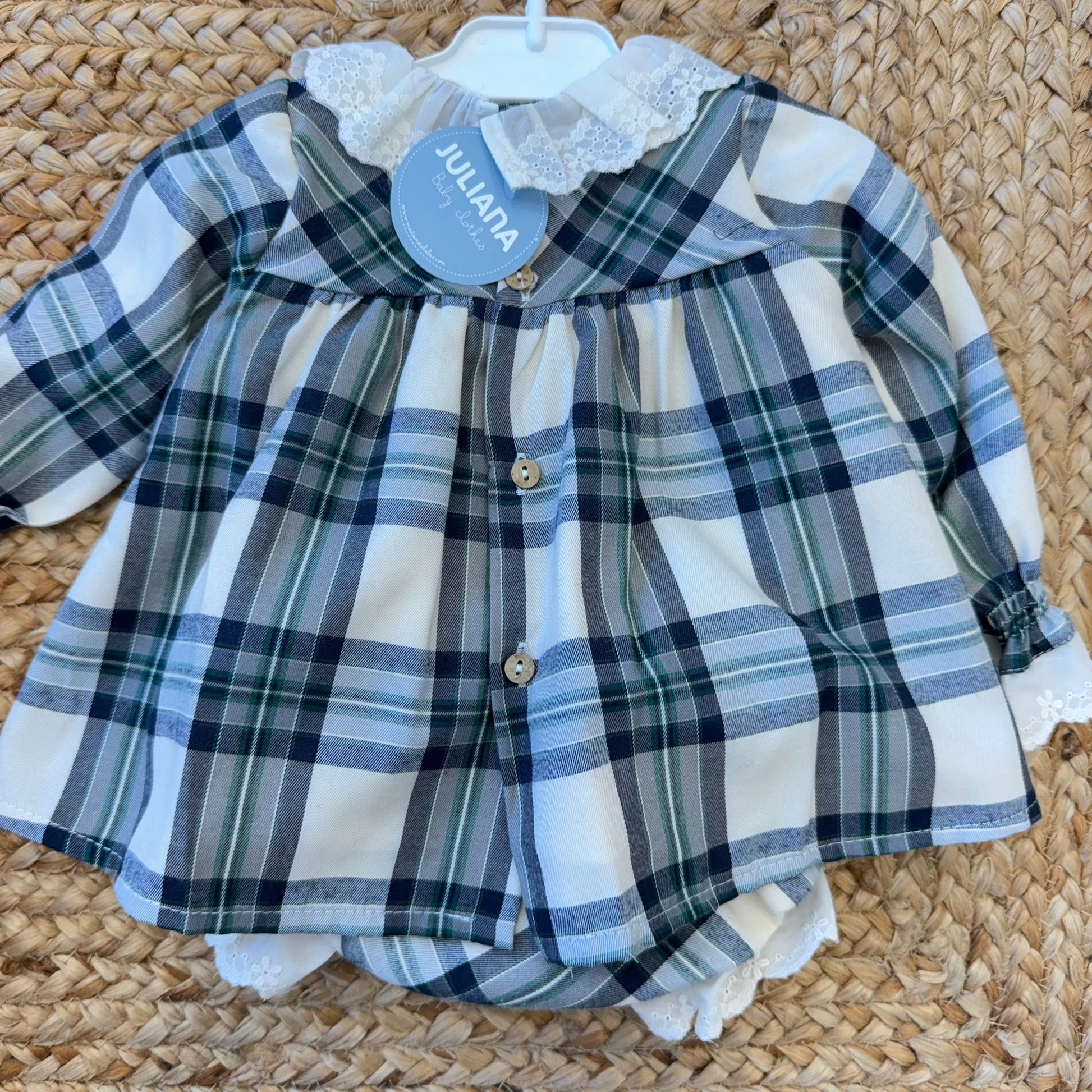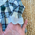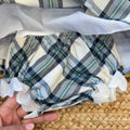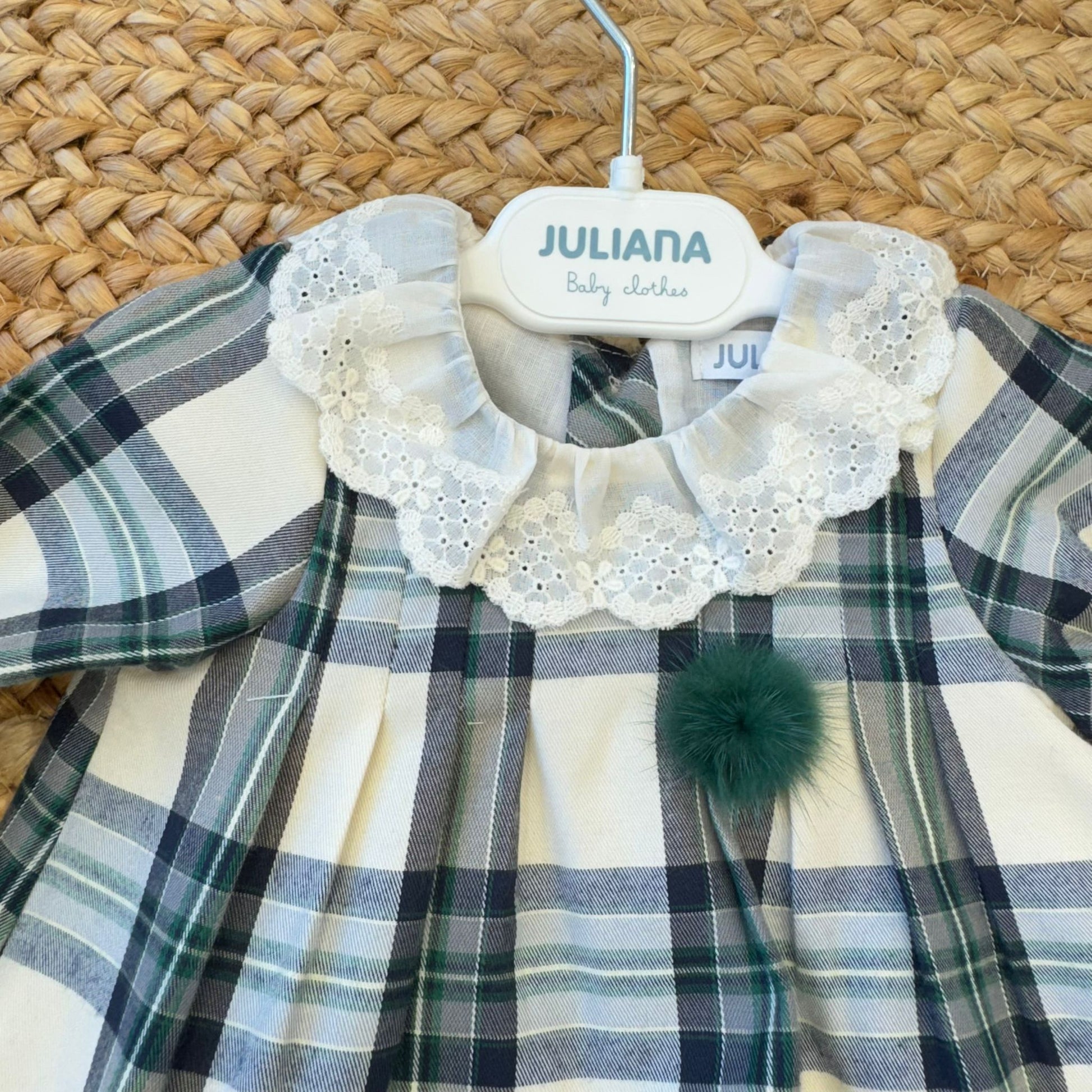 Completo natalizio per neonata composto da abitino in tessuto scozzese verde e panna con culotte coordinata. Il colletto in pizzo sangallo e il pompon verde donano un tocco romantico e festivo. Polsini arricciati con bordo in pizzo e chiusura posteriore con bottoni. Morbido e raffinato, perfetto per le feste.