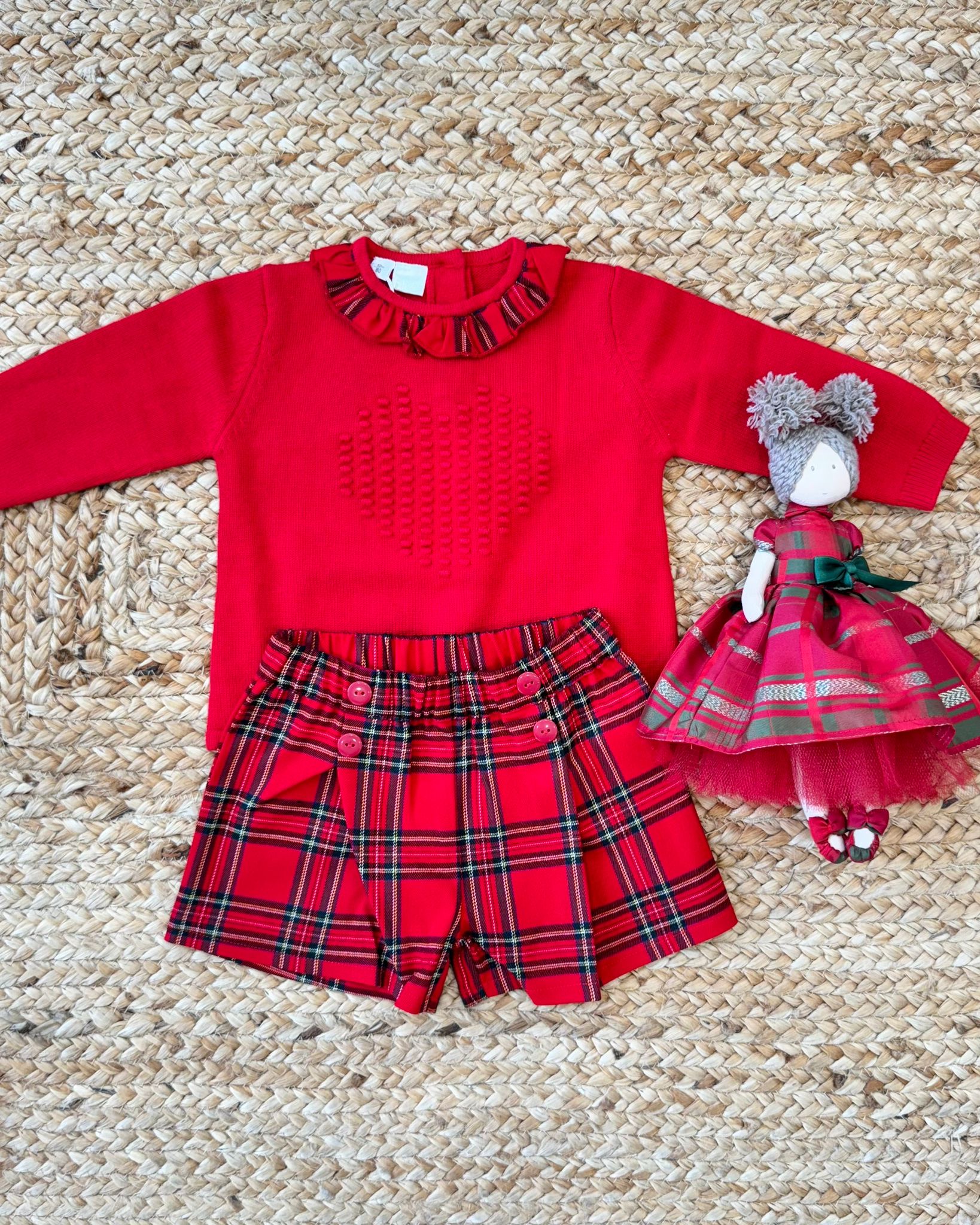 Completo Natalizio Rosso con Maglioncino Cuore e Shorts Tartan