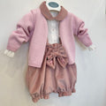 Completo neonata in velluto rosa con camicia bianca e fiocco ricamato