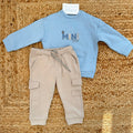 Completo neonato in morbido caldo cotone composto da felpa azzurra con ricamo “Mini Banda” e pantaloni beige con tasche cargo e coulisse regolabile. Un coordinato pratico e comodo, perfetto per il tempo libero e i look quotidiani.