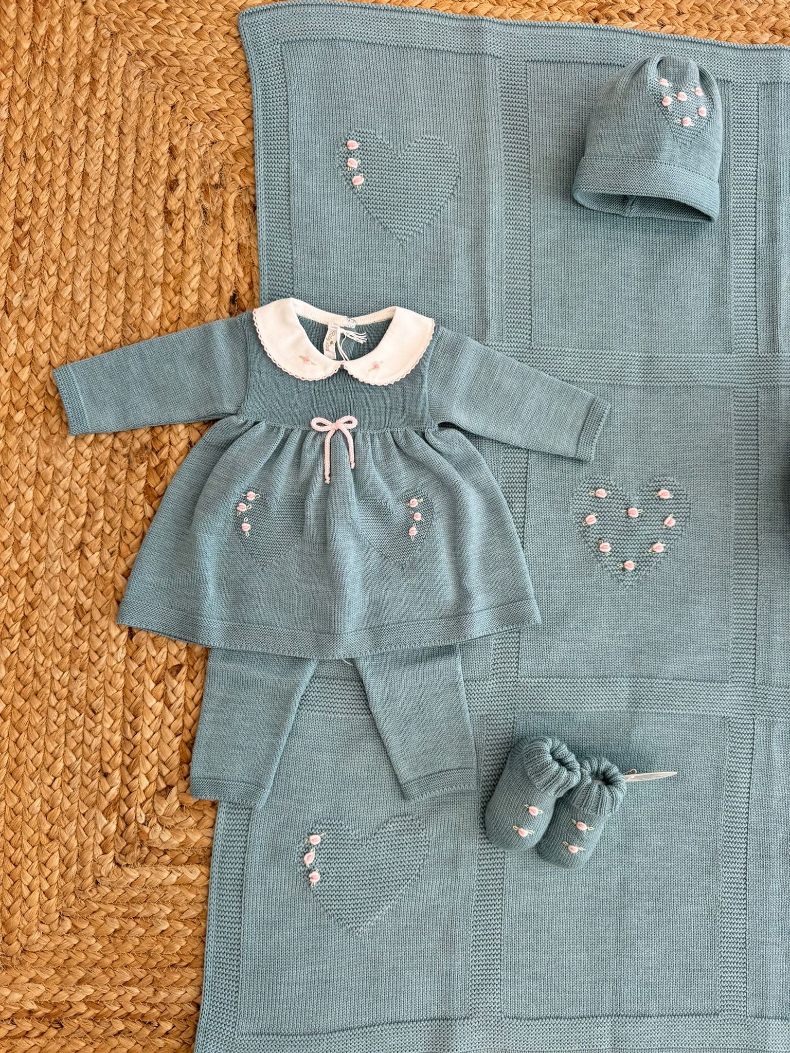 Coordinato neonato in pura lana vergine verde ottanio con ricami rosa Un'esplosione di delicatezza e stile. Questo coordinato, realizzato a mano con lana vergine di altissima qualità, è caratterizzato da raffinati ricami rosa a forma di roselline. Copertina, coprifasce, scarpine e cappellino, perfettamente abbinati, creano un set elegante e romantico. Un regalo perfetto per una nascita speciale. #coordinatoneonatoricamatomanualmente #lanavergine #ricamoroselline #battesimo #regalonascita #eleganza