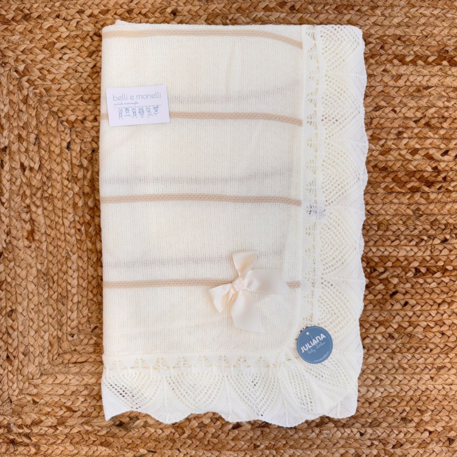 Copertina traforata panna per femminuccia, realizzata in filato morbido misto lana, con righe beige delicate, bordo lavorato a onde e fiocco in raso panna. Un capo raffinato e avvolgente, perfetto per culla o carrozzina durante la stagione fredda. Ideale come regalo nascita o per il primo corredino. Realizzata in filato caldo 50% lana e 50% acrilico.