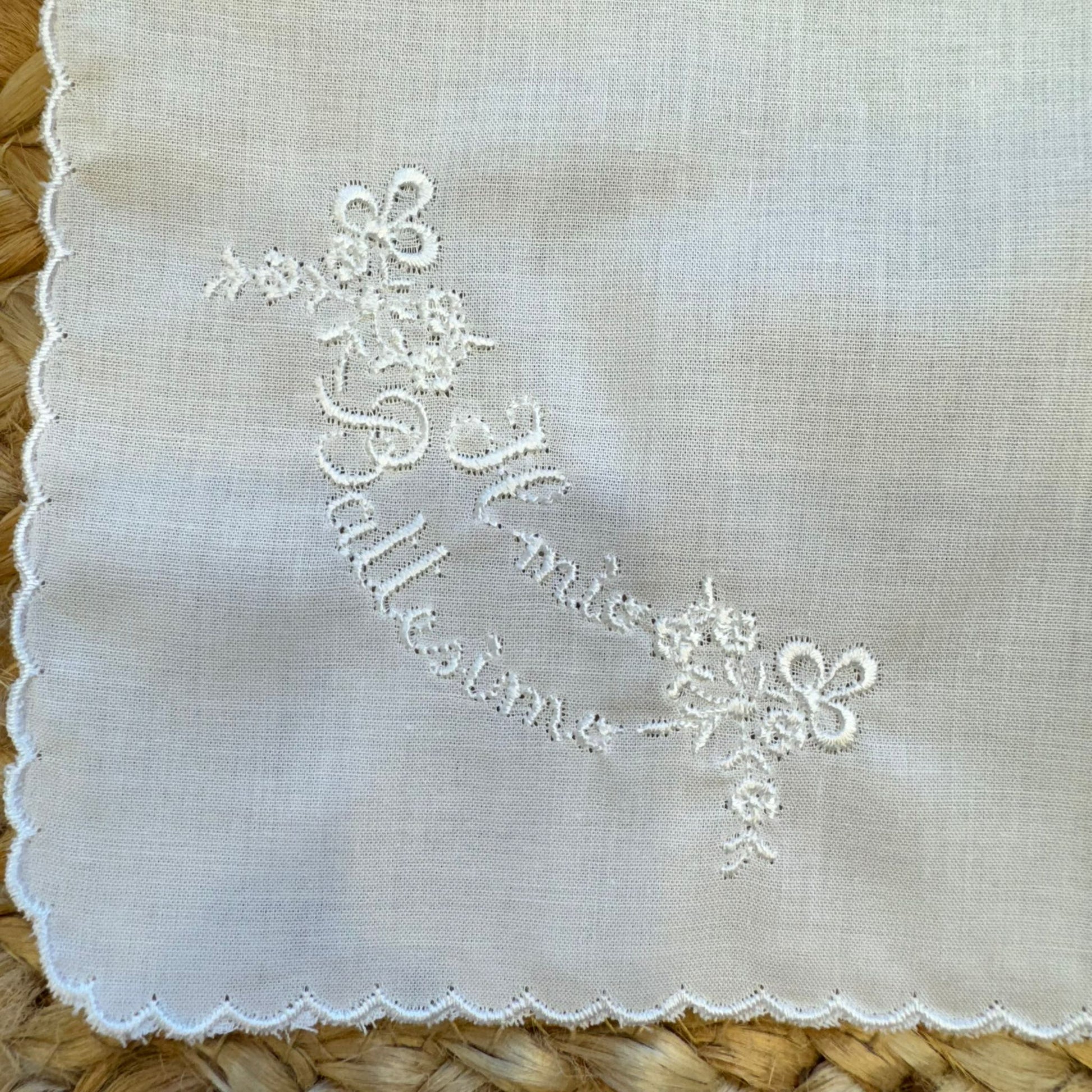 Raffinato fazzoletto per battesimo in battista di cotone 100%, impreziosito da un delicato ricamo bianco latte “Il mio Battesimo” e orlo smerlato. Leggero, elegante e di grande valore simbolico, è perfetto come accessorio per la cerimonia o come ricordo prezioso da conservare nel tempo.