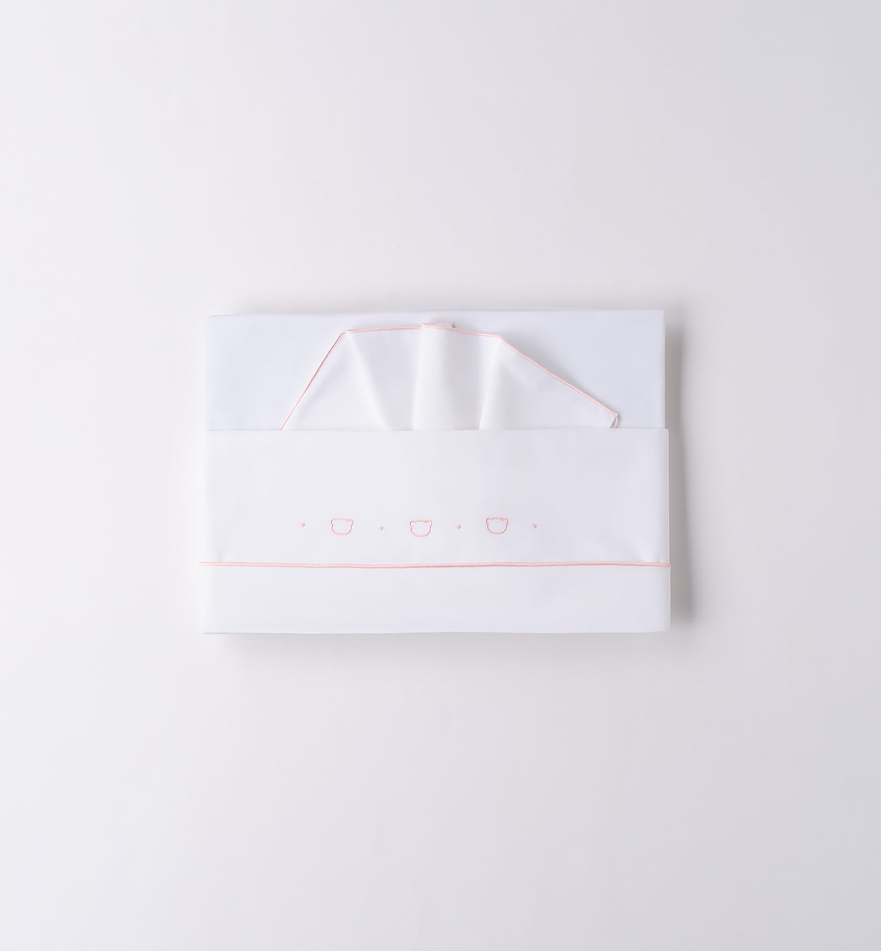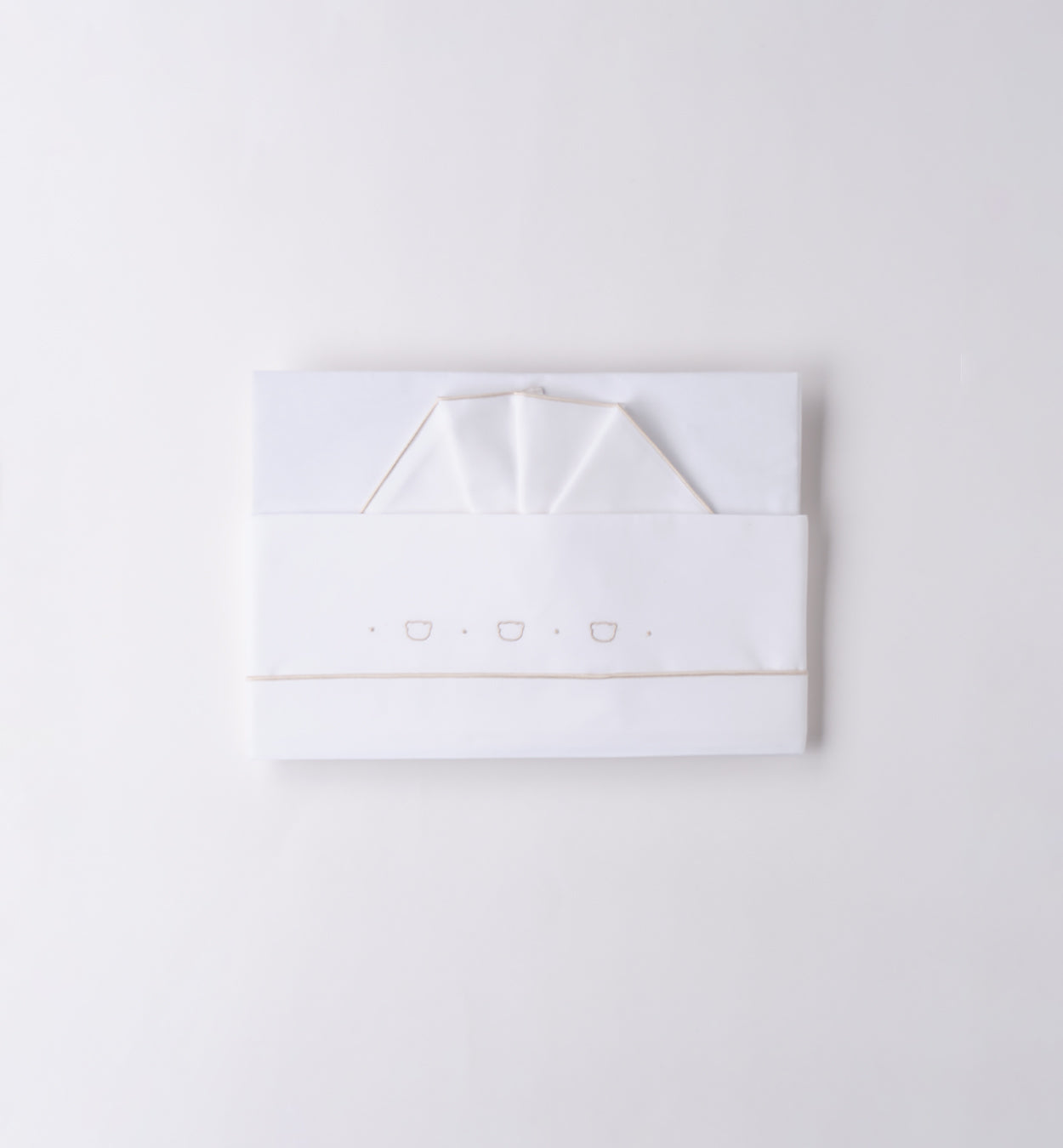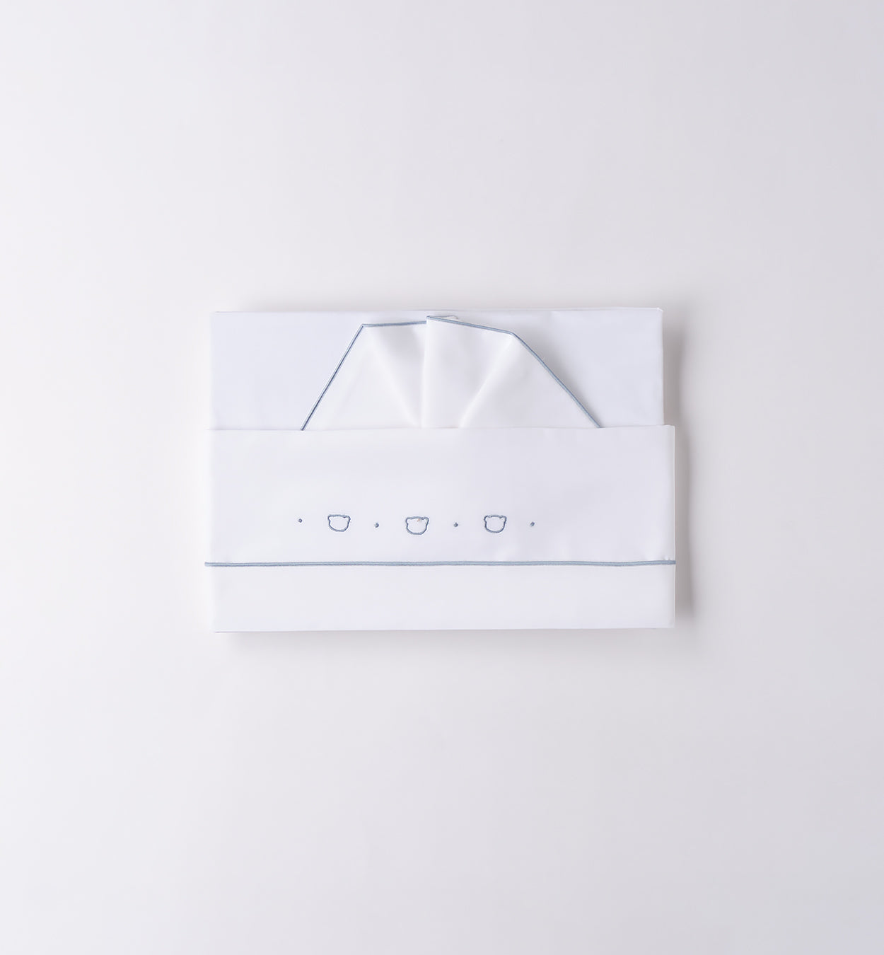 Set lenzuola in 100% puro cotone, morbido e delicato sulla pelle del neonato. Disponibile in tre varianti colore (beige, azzurro e rosa), comprende sopra, sotto con angoli e federa. Il ricamo a motivi orsetto dona un tocco raffinato e dolce, perfetto per corredino e set nascita. Ideale per culla e carrozzina, unisce comfort e pregio artigianale.