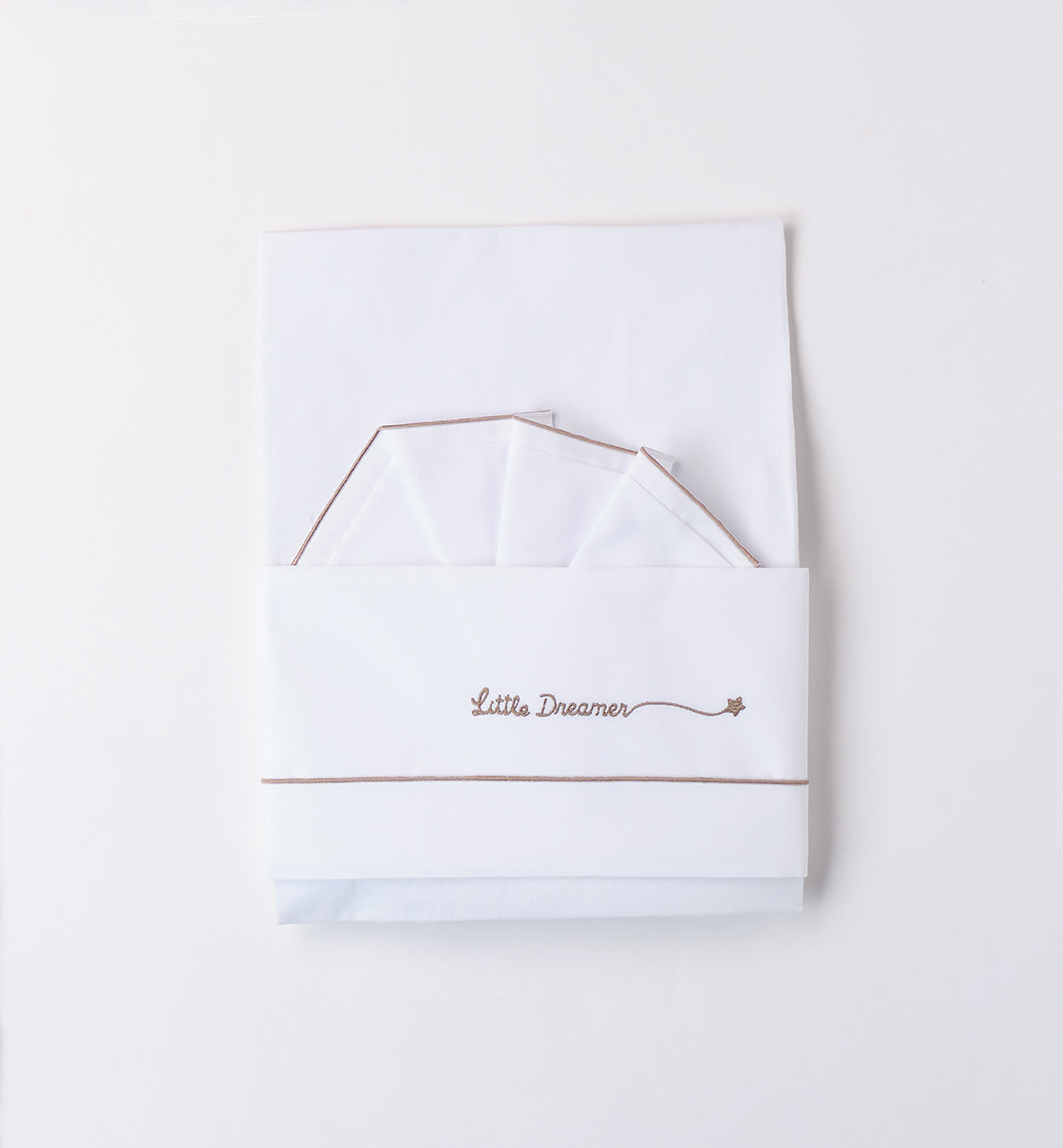 Questo lenzuolo da culla in cotone bianco, con ricamo “Little Dreamer” e bordo in tinta, è un accessorio raffinato e delicato pensato per accompagnare il riposo dei più piccoli.
