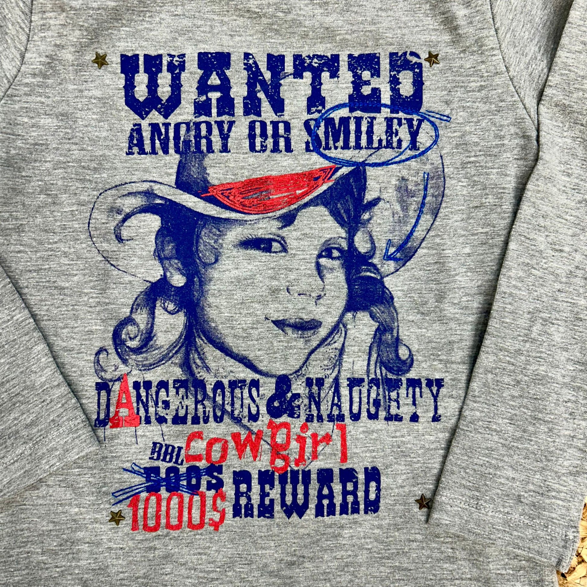 Maglia a maniche lunghe grigia con stampa “Wanted Cowboy”. Morbida e confortevole, perfetta per look casual e dinamici. Ideale per i piccoli amanti dello stile western.