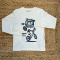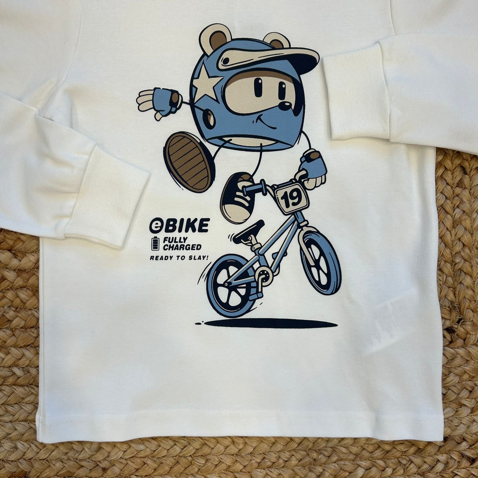 Maglia bimbo panna a maniche lunghe con simpatica stampa di orsetto su bicicletta. Perfetta per la scuola e il tempo libero, unisce comfort e allegria in un capo pratico e divertente da indossare ogni giorno.