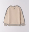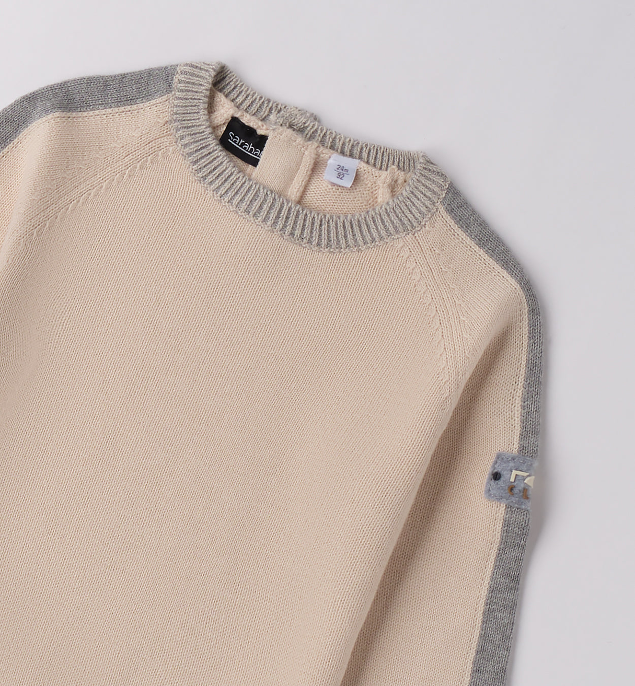 Maglioncino bambino in caldo cotone, color beige con inserti grigi a contrasto su maniche, bordi e scollo. Morbido e pratico, con bottoncini sul retro per una vestibilità comoda. Un capo versatile e chic, ideale per scuola, tempo libero e occasioni speciali.