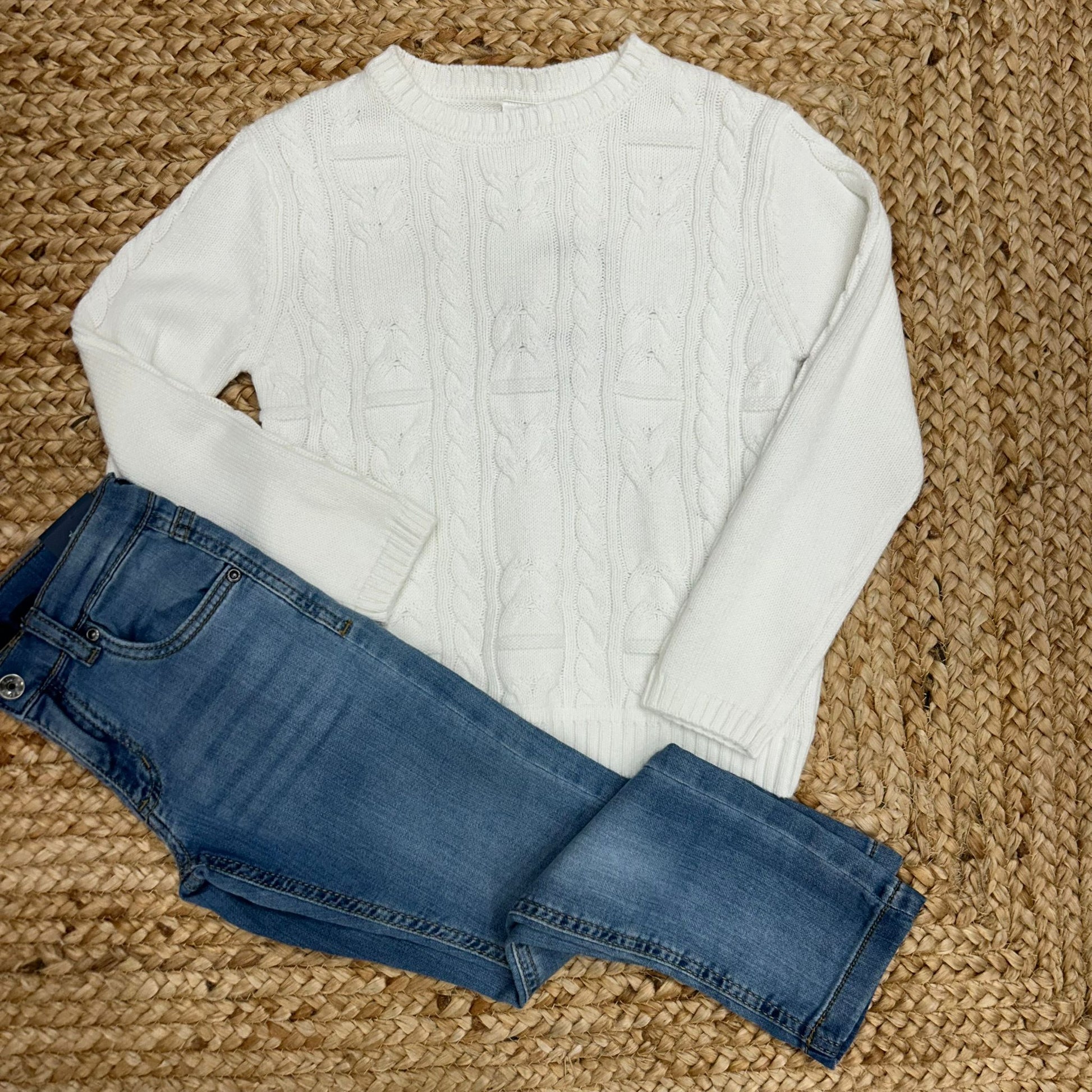 Maglioncino bimbo bianco con raffinata lavorazione a trecce. Realizzato in 55% cotone, 5% lana e 40% poliammide, è morbido, caldo e piacevole sulla pelle. Perfetto per completare il look quotidiano o per le giornate più fresche con un tocco di eleganza senza tempo.