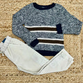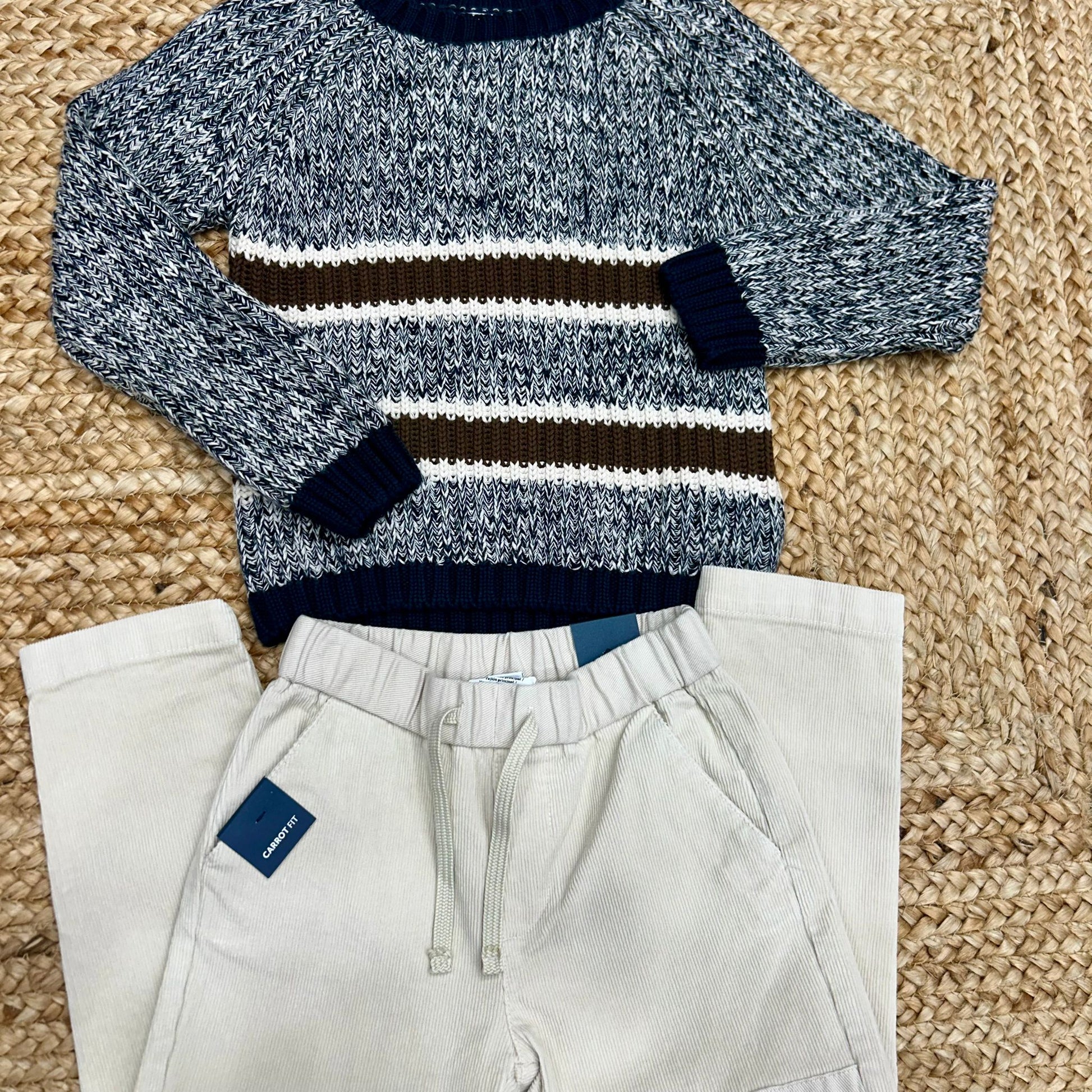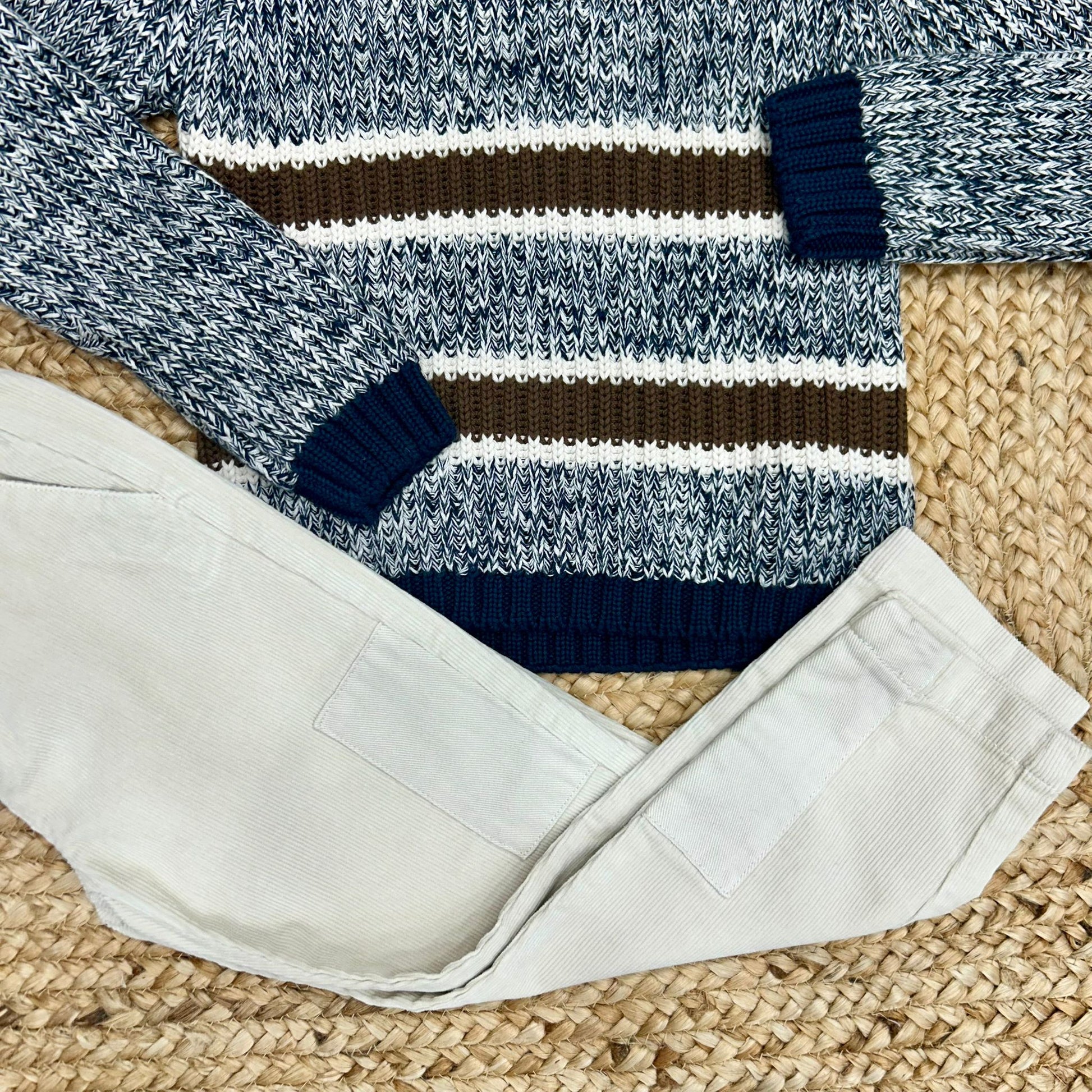 Coordinato bimbo composto da maglioncino in maglia blu mélange con righe panna e marroni, abbinato a pantalone in velluto color panna con elastico e laccetto regolabile. Un look caldo e raffinato, ideale per la stagione fredda e perfetto per ogni occasione casual chic.