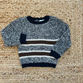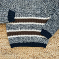 Maglioncino bimbo in filato mélange blu, panna e marrone con lavorazione a righe. Caldo e confortevole, perfetto per la stagione fredda. Il design moderno e i dettagli curati lo rendono ideale sia per look casual che più eleganti.